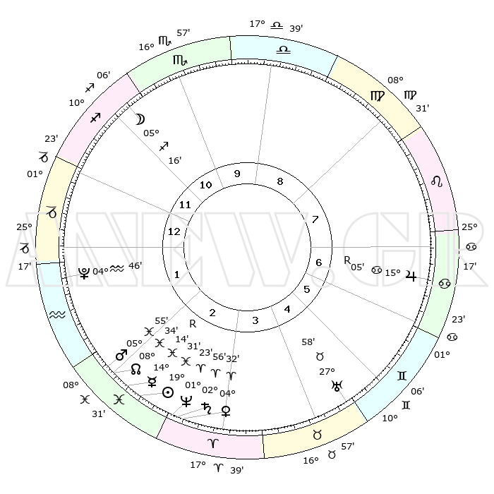| | ΘΕΣΕΙΣ ΠΛΑΝΗΤΩΝ ΑΣΤΡΟΛΟΓΙΚΟΥ ΧΑΡΤΗ ΤΗΣ ΣΤΙΓΜΗΣ ΑΥΤΗΣ | | | | Πλανήτης | Ζώδιο | Μοίρες | Δεκαήμ. | Σε οίκο | Απόκλιση | | Ακμές των οίκων | | Ηλιος | Ιχθείς | 19°27' | Δεύτερο | 2 | 04 S 10 | | 1ος | 02°57' | Αιγόκερως | | Σελήνη | Τοξότης | 04°33' | Πρώτο | 11 | 26 S 13 | | 2ος | 10°52' | Υδροχόος | | Ερμής | Ιχθείς | 14°18'R | Δεύτερο | 2 | 03 S 04 | | 3ος | 21°02' | Ιχθείς | | Αφροδίτη | Κριός | 04°28' | Πρώτο | 3 | 00 N 42 | | 4ος | 24°29' | Κριός | | Αρης | Ιχθείς | 05°52' | Πρώτο | 2 | 10 S 22 | | 5ος | 20°20' | Ταύρος | | Δίας | Καρκίνος | 15°05'R | Δεύτερο | 7 | 22 N 56 | | 6ος | 11°58' | Δίδυμοι | | Κρόνος | Κριός | 02°56' | Πρώτο | 3 | 00 S 47 | | 7ος | 02°57' | Καρκίνος | | Ουρανός | Ταύρος | 27°58' | Τρίτο | 5 | 19 N 32 | | 8ος | 10°52' | Λέων | | Ποσειδώνας | Κριός | 01°23' | Πρώτο | 3 | 00 S 39 | | 9ος | 21°02' | Παρθένος | | Πλούτωνας | Υδροχόος | 04°46' | Πρώτο | 1 | 22 S 50 | | 10ος | 24°29' | Ζυγός | | Β. Δεσμός | Ιχθείς | 08°34' | Πρώτο | 2 | 08 S 21 | | 11ος | 20°20' | Σκορπιός | | Ωροσκόπος | Αιγόκερως | 02°57' | Πρώτο | | | 12ος | 11°58' | Τοξότης | | Μεσουράνημα | Ζυγός | 24°29' | Τρίτο | | | |