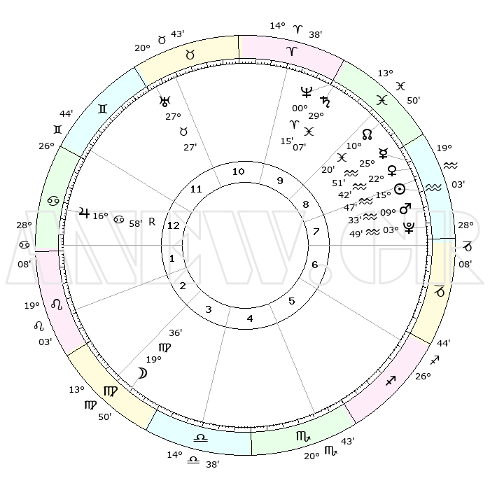 | | ΘΕΣΕΙΣ ΠΛΑΝΗΤΩΝ ΑΣΤΡΟΛΟΓΙΚΟΥ ΧΑΡΤΗ ΤΗΣ ΣΤΙΓΜΗΣ ΑΥΤΗΣ | | | | Πλανήτης | Ζώδιο | Μοίρες | Δεκαήμ. | Σε οίκο | Απόκλιση | | Ακμές των οίκων | | Ηλιος | Υδροχόος | 15°42' | Δεύτερο | 8 | 16 S 08 | | 1ος | 04°52' | Καρκίνος | | Σελήνη | Παρθένος | 18°35' | Δεύτερο | 4 | 03 N 43 | | 2ος | 25°25' | Καρκίνος | | Ερμής | Υδροχόος | 25°43' | Τρίτο | 9 | 14 S 27 | | 3ος | 17°35' | Λέων | | Αφροδίτη | Υδροχόος | 22°36' | Τρίτο | 9 | 15 S 18 | | 4ος | 14°41' | Παρθένος | | Αρης | Υδροχόος | 09°30' | Πρώτο | 8 | 18 S 53 | | 5ος | 19°21' | Ζυγός | | Δίας | Καρκίνος | 16°59'R | Δεύτερο | 1 | 22 N 40 | | 6ος | 28°55' | Σκορπιός | | Κρόνος | Ιχθείς | 29°07' | Τρίτο | 10 | 02 S 21 | | 7ος | 04°52' | Αιγόκερως | | Ουρανός | Ταύρος | 27°27' | Τρίτο | 11 | 19 N 24 | | 8ος | 25°25' | Αιγόκερως | | Ποσειδώνας | Κριός | 00°15' | Πρώτο | 10 | 01 S 07 | | 9ος | 17°35' | Υδροχόος | | Πλούτωνας | Υδροχόος | 03°49' | Πρώτο | 8 | 23 S 00 | | 10ος | 14°41' | Ιχθείς | | Β. Δεσμός | Ιχθείς | 10°20' | Δεύτερο | 9 | 07 S 41 | | 11ος | 19°21' | Κριός | | Ωροσκόπος | Καρκίνος | 04°52' | Πρώτο | | | 12ος | 28°55' | Ταύρος | | Μεσουράνημα | Ιχθείς | 14°41' | Δεύτερο | | | |