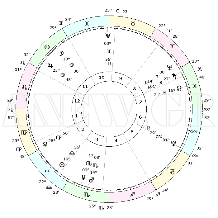 | ΘΕΣΕΙΣ ΠΛΑΝΗΤΩΝ ΑΣΤΡΟΛΟΓΙΚΟΥ ΧΑΡΤΗ ΤΗΣ ΣΤΙΓΜΗΣ ΑΥΤΗΣ | | Πλανήτης | Ζώδιο | Μοίρες | Δεκαήμ. | Σε οίκο | Απόκλιση | | Ακμές των οίκων | Ηλιος | Ζυγός | 19°51' | Δεύτερο | 3 | 07 S 45 | | 1ος | 03°59' | Λέων | Σελήνη | Καρκίνος | 09°15' | Πρώτο | 12 | 27 N 57 | | 2ος | 25°18' | Λέων | Ερμής | Σκορπιός | 09°09' | Πρώτο | 4 | 15 S 58 | | 3ος | 20°53' | Παρθένος | Αφροδίτη | Παρθένος | 28°49' | Τρίτο | 3 | 01 N 50 | | 4ος | 22°23' | Ζυγός | Αρης | Σκορπιός | 14°04' | Δεύτερο | 4 | 16 S 15 | | 5ος | 28°18' | Σκορπιός | Δίας | Καρκίνος | 23°45' | Τρίτο | 12 | 21 N 23 | | 6ος | 03°22' | Αιγόκερως | Κρόνος | Ιχθείς | 27°01'R | Τρίτο | 9 | 03 S 29 | | 7ος | 03°59' | Υδροχόος | Ουρανός | Δίδυμοι | 00°55'R | Πρώτο | 11 | 20 N 08 | | 8ος | 25°18' | Υδροχόος | Ποσειδώνας | Κριός | 00°14'R | Πρώτο | 9 | 01 S 10 | | 9ος | 20°53' | Ιχθείς | Πλούτωνας | Υδροχόος | 01°22'R | Πρώτο | 6 | 23 S 32 | | 10ος | 22°23' | Κριός | Β. Δεσμός | Ιχθείς | 16°25' | Δεύτερο | 8 | 05 S 22 | | 11ος | 28°18' | Ταύρος | Ωροσκόπος | Λέων | 03°59' | Πρώτο | | | 12ος | 03°22' | Καρκίνος | Μεσουράνημα | Κριός | 22°23' | Τρίτο | | | |