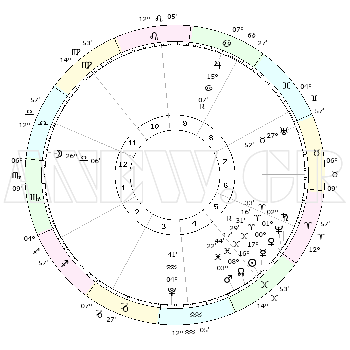 | | ΘΕΣΕΙΣ ΠΛΑΝΗΤΩΝ ΑΣΤΡΟΛΟΓΙΚΟΥ ΧΑΡΤΗ ΤΗΣ ΣΤΙΓΜΗΣ ΑΥΤΗΣ | | | | Πλανήτης | Ζώδιο | Μοίρες | Δεκαήμ. | Σε οίκο | Απόκλιση | | Ακμές των οίκων | | Ηλιος | Ιχθείς | 15°56' | Δεύτερο | 9 | 05 S 33 | | 1ος | 26°04' | Καρκίνος | | Σελήνη | Ζυγός | 21°51' | Τρίτο | 4 | 11 S 50 | | 2ος | 16°53' | Λέων | | Ερμής | Ιχθείς | 17°49'R | Δεύτερο | 9 | 01 S 25 | | 3ος | 11°24' | Παρθένος | | Αφροδίτη | Κριός | 00°05'R | Πρώτο | 9 | 01 S 07 | | 4ος | 11°55' | Ζυγός | | Αρης | Ιχθείς | 03°06' | Πρώτο | 8 | 11 S 23 | | 5ος | 18°00' | Σκορπιός | | Δίας | Καρκίνος | 15°07'R | Δεύτερο | 12 | 22 N 55 | | 6ος | 24°22' | Τοξότης | | Κρόνος | Κριός | 02°30' | Πρώτο | 9 | 00 S 57 | | 7ος | 26°04' | Αιγόκερως | | Ουρανός | Ταύρος | 27°52' | Τρίτο | 11 | 19 N 30 | | 8ος | 16°53' | Υδροχόος | | Ποσειδώνας | Κριός | 01°15' | Πρώτο | 9 | 00 S 42 | | 9ος | 11°24' | Ιχθείς | | Πλούτωνας | Υδροχόος | 04°41' | Πρώτο | 7 | 22 S 51 | | 10ος | 11°55' | Κριός | | Β. Δεσμός | Ιχθείς | 08°45' | Πρώτο | 8 | 08 S 17 | | 11ος | 18°00' | Ταύρος | | Ωροσκόπος | Καρκίνος | 26°04' | Τρίτο | | | 12ος | 24°22' | Δίδυμοι | | Μεσουράνημα | Κριός | 11°55' | Δεύτερο | | | |