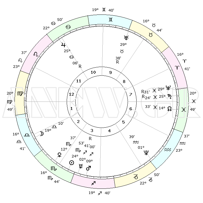 | | ΘΕΣΕΙΣ ΠΛΑΝΗΤΩΝ ΑΣΤΡΟΛΟΓΙΚΟΥ ΧΑΡΤΗ ΤΗΣ ΣΤΙΓΜΗΣ ΑΥΤΗΣ | | | | Πλανήτης | Ζώδιο | Μοίρες | Δεκαήμ. | Σε οίκο | Απόκλιση | | Ακμές των οίκων | | Ηλιος | Σκορπιός | 24°47' | Τρίτο | 4 | 18 S 57 | | 1ος | 19°48' | Λέων | | Σελήνη | Ζυγός | 17°53' | Δεύτερο | 3 | 09 S 29 | | 2ος | 12°35' | Παρθένος | | Ερμής | Τοξότης | 02°48'R | Πρώτο | 4 | 21 S 21 | | 3ος | 10°12' | Ζυγός | | Αφροδίτη | Σκορπιός | 12°29' | Δεύτερο | 3 | 14 S 29 | | 4ος | 12°51' | Σκορπιός | | Αρης | Τοξότης | 08°56' | Πρώτο | 4 | 22 S 19 | | 5ος | 17°47' | Τοξότης | | Δίας | Καρκίνος | 25°06'R | Τρίτο | 12 | 21 N 14 | | 6ος | 20°42' | Αιγόκερως | | Κρόνος | Ιχθείς | 25°24'R | Τρίτο | 8 | 04 S 03 | | 7ος | 19°48' | Υδροχόος | | Ουρανός | Ταύρος | 29°38'R | Τρίτο | 10 | 19 N 52 | | 8ος | 12°35' | Ιχθείς | | Ποσειδώνας | Ιχθείς | 29°32'R | Τρίτο | 8 | 01 S 26 | | 9ος | 10°12' | Κριός | | Πλούτωνας | Υδροχόος | 01°38' | Πρώτο | 6 | 23 S 28 | | 10ος | 12°51' | Ταύρος | | Β. Δεσμός | Ιχθείς | 14°33' | Δεύτερο | 8 | 06 S 05 | | 11ος | 17°47' | Δίδυμοι | | Ωροσκόπος | Λέων | 19°48' | Δεύτερο | | | 12ος | 20°42' | Καρκίνος | | Μεσουράνημα | Ταύρος | 12°51' | Δεύτερο | | | |