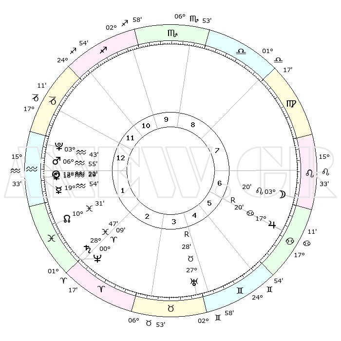 | | ΘΕΣΕΙΣ ΠΛΑΝΗΤΩΝ ΑΣΤΡΟΛΟΓΙΚΟΥ ΧΑΡΤΗ ΤΗΣ ΣΤΙΓΜΗΣ ΑΥΤΗΣ | | | | Πλανήτης | Ζώδιο | Μοίρες | Δεκαήμ. | Σε οίκο | Απόκλιση | | Ακμές των οίκων | | Ηλιος | Υδροχόος | 12°18' | Δεύτερο | 1 | 17 S 06 | | 1ος | 16°26' | Αιγόκερως | | Σελήνη | Λέων | 02°21' | Πρώτο | 7 | 22 N 40 | | 2ος | 27°45' | Υδροχόος | | Ερμής | Υδροχόος | 19°47' | Δεύτερο | 1 | 16 S 39 | | 3ος | 07°46' | Κριός | | Αφροδίτη | Υδροχόος | 18°24' | Δεύτερο | 1 | 16 S 36 | | 4ος | 08°44' | Ταύρος | | Αρης | Υδροχόος | 06°52' | Πρώτο | 1 | 19 S 34 | | 5ος | 02°46' | Δίδυμοι | | Δίας | Καρκίνος | 17°20'R | Δεύτερο | 7 | 22 N 37 | | 6ος | 23°59' | Δίδυμοι | | Κρόνος | Ιχθείς | 28°46' | Τρίτο | 2 | 02 S 29 | | 7ος | 16°26' | Καρκίνος | | Ουρανός | Ταύρος | 27°28'R | Τρίτο | 4 | 19 N 24 | | 8ος | 27°45' | Λέων | | Ποσειδώνας | Κριός | 00°09' | Πρώτο | 2 | 01 S 09 | | 9ος | 07°46' | Ζυγός | | Πλούτωνας | Υδροχόος | 03°42' | Πρώτο | 1 | 23 S 01 | | 10ος | 08°44' | Σκορπιός | | Β. Δεσμός | Ιχθείς | 10°31' | Δεύτερο | 2 | 07 S 37 | | 11ος | 02°46' | Τοξότης | | Ωροσκόπος | Αιγόκερως | 16°26' | Δεύτερο | | | 12ος | 23°59' | Τοξότης | | Μεσουράνημα | Σκορπιός | 08°44' | Πρώτο | | | |