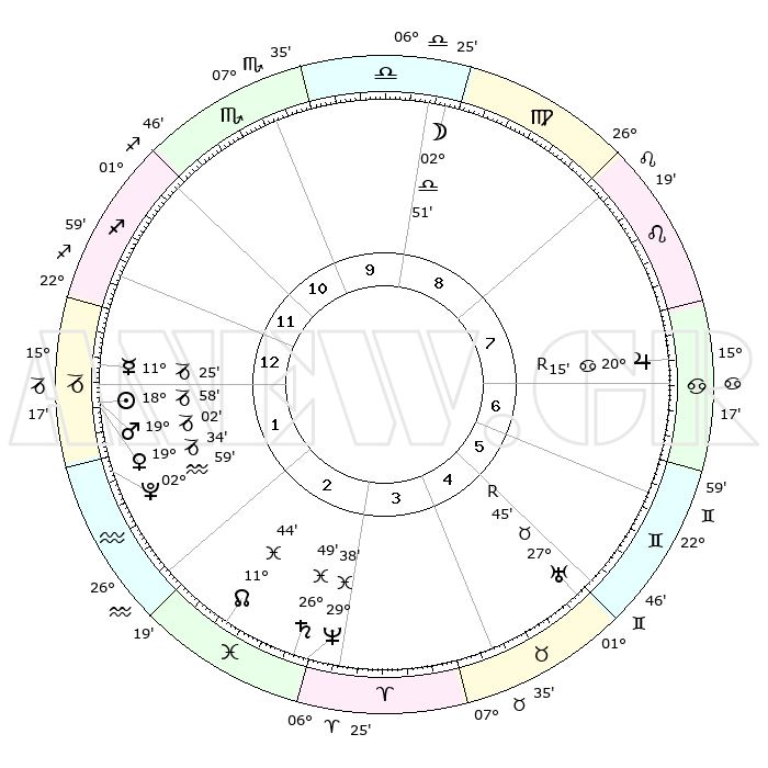 | | ΘΕΣΕΙΣ ΠΛΑΝΗΤΩΝ ΑΣΤΡΟΛΟΓΙΚΟΥ ΧΑΡΤΗ ΤΗΣ ΣΤΙΓΜΗΣ ΑΥΤΗΣ | | | | Πλανήτης | Ζώδιο | Μοίρες | Δεκαήμ. | Σε οίκο | Απόκλιση | | Ακμές των οίκων | | Ηλιος | Αιγόκερως | 18°01' | Δεύτερο | 11 | 22 S 13 | | 1ος | 18°51' | Υδροχόος | | Σελήνη | Παρθένος | 21°12' | Τρίτο | 7 | 02 N 36 | | 2ος | 04°40' | Κριός | | Ερμής | Αιγόκερως | 09°59' | Πρώτο | 11 | 24 S 21 | | 3ος | 09°36' | Ταύρος | | Αφροδίτη | Αιγόκερως | 18°25' | Δεύτερο | 11 | 22 S 56 | | 4ος | 05°15' | Δίδυμοι | | Αρης | Αιγόκερως | 18°19' | Δεύτερο | 11 | 23 S 06 | | 5ος | 27°06' | Δίδυμοι | | Δίας | Καρκίνος | 20°23'R | Τρίτο | 6 | 22 N 08 | | 6ος | 19°38' | Καρκίνος | | Κρόνος | Ιχθείς | 26°45' | Τρίτο | 1 | 03 S 21 | | 7ος | 18°51' | Λέων | | Ουρανός | Ταύρος | 27°46'R | Τρίτο | 3 | 19 N 28 | | 8ος | 04°40' | Ζυγός | | Ποσειδώνας | Ιχθείς | 29°37' | Τρίτο | 1 | 01 S 22 | | 9ος | 09°36' | Σκορπιός | | Πλούτωνας | Υδροχόος | 02°57' | Πρώτο | 12 | 23 S 10 | | 10ος | 05°15' | Τοξότης | | Β. Δεσμός | Ιχθείς | 11°47' | Δεύτερο | 1 | 07 S 09 | | 11ος | 27°06' | Τοξότης | | Ωροσκόπος | Υδροχόος | 18°51' | Δεύτερο | | | 12ος | 19°38' | Αιγόκερως | | Μεσουράνημα | Τοξότης | 05°15' | Πρώτο | | | |