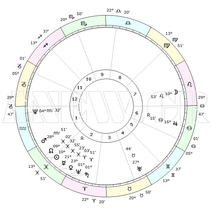 | | ΘΕΣΕΙΣ ΠΛΑΝΗΤΩΝ ΑΣΤΡΟΛΟΓΙΚΟΥ ΧΑΡΤΗ ΤΗΣ ΣΤΙΓΜΗΣ ΑΥΤΗΣ | | | | Πλανήτης | Ζώδιο | Μοίρες | Δεκαήμ. | Σε οίκο | Απόκλιση | | Ακμές των οίκων | | Ηλιος | Ιχθείς | 10°28' | Δεύτερο | 2 | 07 S 38 | | 1ος | 04°45' | Αιγόκερως | | Σελήνη | Λέων | 09°58' | Πρώτο | 7 | 20 N 13 | | 2ος | 13°07' | Υδροχόος | | Ερμής | Ιχθείς | 21°57'R | Τρίτο | 2 | 00 S 09 | | 3ος | 23°22' | Ιχθείς | | Αφροδίτη | Ιχθείς | 23°18' | Τρίτο | 2 | 03 S 54 | | 4ος | 26°30' | Κριός | | Αρης | Υδροχόος | 28°48' | Τρίτο | 2 | 12 S 55 | | 5ος | 22°05' | Ταύρος | | Δίας | Καρκίνος | 15°15'R | Δεύτερο | 7 | 22 N 54 | | 6ος | 13°37' | Δίδυμοι | | Κρόνος | Κριός | 01°51' | Πρώτο | 3 | 01 S 13 | | 7ος | 04°45' | Καρκίνος | | Ουρανός | Ταύρος | 27°44' | Τρίτο | 5 | 19 N 28 | | 8ος | 13°07' | Λέων | | Ποσειδώνας | Κριός | 01°03' | Πρώτο | 3 | 00 S 47 | | 9ος | 23°22' | Παρθένος | | Πλούτωνας | Υδροχόος | 04°32' | Πρώτο | 1 | 22 S 52 | | 10ος | 26°30' | Ζυγός | | Β. Δεσμός | Ιχθείς | 09°03' | Πρώτο | 2 | 08 S 11 | | 11ος | 22°05' | Σκορπιός | | Ωροσκόπος | Αιγόκερως | 04°45' | Πρώτο | | | 12ος | 13°37' | Τοξότης | | Μεσουράνημα | Ζυγός | 26°30' | Τρίτο | | | |
