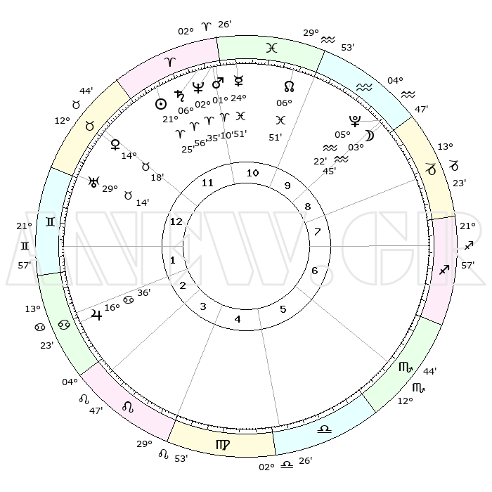 | | ΘΕΣΕΙΣ ΠΛΑΝΗΤΩΝ ΑΣΤΡΟΛΟΓΙΚΟΥ ΧΑΡΤΗ ΤΗΣ ΣΤΙΓΜΗΣ ΑΥΤΗΣ | | | | Πλανήτης | Ζώδιο | Μοίρες | Δεκαήμ. | Σε οίκο | Απόκλιση | | Ακμές των οίκων | | Ηλιος | Κριός | 21°21' | Τρίτο | 12 | 08 N 20 | | 1ος | 23°19' | Ταύρος | | Σελήνη | Υδροχόος | 02°51' | Πρώτο | 9 | 22 S 25 | | 2ος | 19°33' | Δίδυμοι | | Ερμής | Ιχθείς | 24°45' | Τρίτο | 11 | 04 S 18 | | 3ος | 11°16' | Καρκίνος | | Αφροδίτη | Ταύρος | 14°13' | Δεύτερο | 12 | 16 N 06 | | 4ος | 03°36' | Λέων | | Αρης | Κριός | 01°07' | Πρώτο | 11 | 00 S 29 | | 5ος | 00°58' | Παρθένος | | Δίας | Καρκίνος | 16°36' | Δεύτερο | 3 | 22 N 47 | | 6ος | 08°16' | Ζυγός | | Κρόνος | Κριός | 06°56' | Πρώτο | 11 | 00 N 47 | | 7ος | 23°19' | Σκορπιός | | Ουρανός | Ταύρος | 29°14' | Τρίτο | 1 | 19 N 49 | | 8ος | 19°33' | Τοξότης | | Ποσειδώνας | Κριός | 02°35' | Πρώτο | 11 | 00 S 10 | | 9ος | 11°16' | Αιγόκερως | | Πλούτωνας | Υδροχόος | 05°22' | Πρώτο | 10 | 22 S 47 | | 10ος | 03°36' | Υδροχόος | | Β. Δεσμός | Ιχθείς | 06°52' | Πρώτο | 11 | 08 S 59 | | 11ος | 00°58' | Ιχθείς | | Ωροσκόπος | Ταύρος | 23°19' | Τρίτο | | | 12ος | 08°16' | Κριός | | Μεσουράνημα | Υδροχόος | 03°36' | Πρώτο | | | |