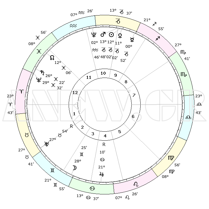 | | ΘΕΣΕΙΣ ΠΛΑΝΗΤΩΝ ΑΣΤΡΟΛΟΓΙΚΟΥ ΧΑΡΤΗ ΤΗΣ ΣΤΙΓΜΗΣ ΑΥΤΗΣ | | | | Πλανήτης | Ζώδιο | Μοίρες | Δεκαήμ. | Σε οίκο | Απόκλιση | | Ακμές των οίκων | | Ηλιος | Αιγόκερως | 11°58' | Δεύτερο | 11 | 22 S 54 | | 1ος | 10°11' | Ιχθείς | | Σελήνη | Δίδυμοι | 27°17' | Τρίτο | 4 | 28 N 16 | | 2ος | 24°27' | Κριός | | Ερμής | Αιγόκερως | 00°45' | Πρώτο | 10 | 24 S 09 | | 3ος | 25°12' | Ταύρος | | Αφροδίτη | Αιγόκερως | 10°56' | Δεύτερο | 11 | 23 S 32 | | 4ος | 18°42' | Δίδυμοι | | Αρης | Αιγόκερως | 13°45' | Δεύτερο | 11 | 23 S 37 | | 5ος | 10°26' | Καρκίνος | | Δίας | Καρκίνος | 21°10'R | Τρίτο | 5 | 22 N 00 | | 6ος | 05°08' | Λέων | | Κρόνος | Ιχθείς | 26°22' | Τρίτο | 1 | 03 S 31 | | 7ος | 10°11' | Παρθένος | | Ουρανός | Ταύρος | 27°54'R | Τρίτο | 3 | 19 N 30 | | 8ος | 24°27' | Ζυγός | | Ποσειδώνας | Ιχθείς | 29°32' | Τρίτο | 1 | 01 S 25 | | 9ος | 25°12' | Σκορπιός | | Πλούτωνας | Υδροχόος | 02°46' | Πρώτο | 11 | 23 S 13 | | 10ος | 18°42' | Τοξότης | | Β. Δεσμός | Ιχθείς | 12°06' | Δεύτερο | 1 | 07 S 01 | | 11ος | 10°26' | Αιγόκερως | | Ωροσκόπος | Ιχθείς | 10°11' | Δεύτερο | | | 12ος | 05°08' | Υδροχόος | | Μεσουράνημα | Τοξότης | 18°42' | Δεύτερο | | | |