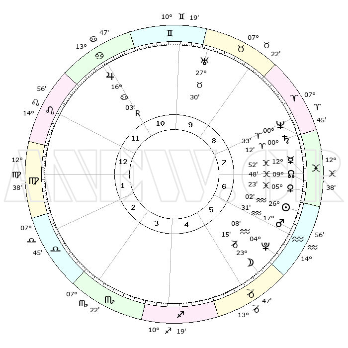 | | ΘΕΣΕΙΣ ΠΛΑΝΗΤΩΝ ΑΣΤΡΟΛΟΓΙΚΟΥ ΧΑΡΤΗ ΤΗΣ ΣΤΙΓΜΗΣ ΑΥΤΗΣ | | | | Πλανήτης | Ζώδιο | Μοίρες | Δεκαήμ. | Σε οίκο | Απόκλιση | | Ακμές των οίκων | | Ηλιος | Υδροχόος | 25°58' | Τρίτο | 6 | 12 S 51 | | 1ος | 26°00' | Λέων | | Σελήνη | Αιγόκερως | 22°33' | Τρίτο | 5 | 25 S 19 | | 2ος | 19°27' | Παρθένος | | Ερμής | Ιχθείς | 12°47' | Δεύτερο | 7 | 06 S 47 | | 3ος | 17°44' | Ζυγός | | Αφροδίτη | Ιχθείς | 05°19' | Πρώτο | 7 | 10 S 55 | | 4ος | 20°35' | Σκορπιός | | Αρης | Υδροχόος | 17°28' | Δεύτερο | 6 | 16 S 37 | | 5ος | 25°03' | Τοξότης | | Δίας | Καρκίνος | 16°03'R | Δεύτερο | 11 | 22 N 48 | | 6ος | 27°21' | Αιγόκερως | | Κρόνος | Κριός | 00°11' | Πρώτο | 8 | 01 S 54 | | 7ος | 26°00' | Υδροχόος | | Ουρανός | Ταύρος | 27°30' | Τρίτο | 10 | 19 N 25 | | 8ος | 19°27' | Ιχθείς | | Ποσειδώνας | Κριός | 00°33' | Πρώτο | 8 | 00 S 59 | | 9ος | 17°44' | Κριός | | Πλούτωνας | Υδροχόος | 04°08' | Πρώτο | 6 | 22 S 57 | | 10ος | 20°35' | Ταύρος | | Β. Δεσμός | Ιχθείς | 09°48' | Πρώτο | 7 | 07 S 53 | | 11ος | 25°03' | Δίδυμοι | | Ωροσκόπος | Λέων | 26°00' | Τρίτο | | | 12ος | 27°21' | Καρκίνος | | Μεσουράνημα | Ταύρος | 20°35' | Τρίτο | | | |
