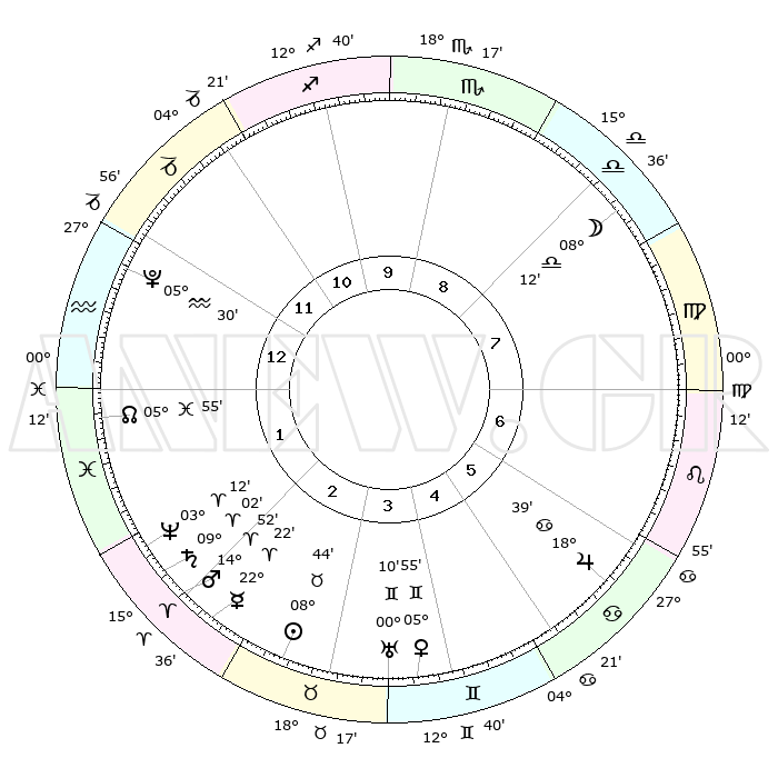 | | ΘΕΣΕΙΣ ΠΛΑΝΗΤΩΝ ΑΣΤΡΟΛΟΓΙΚΟΥ ΧΑΡΤΗ ΤΗΣ ΣΤΙΓΜΗΣ ΑΥΤΗΣ | | | | Πλανήτης | Ζώδιο | Μοίρες | Δεκαήμ. | Σε οίκο | Απόκλιση | | Ακμές των οίκων | | Ηλιος | Ταύρος | 08°42' | Πρώτο | 3 | 14 N 24 | | 1ος | 12°34' | Υδροχόος | | Σελήνη | Ζυγός | 07°46' | Πρώτο | 8 | 05 S 27 | | 2ος | 28°08' | Ιχθείς | | Ερμής | Κριός | 22°18' | Τρίτο | 2 | 06 N 42 | | 3ος | 04°20' | Ταύρος | | Αφροδίτη | Δίδυμοι | 05°52' | Πρώτο | 4 | 22 N 05 | | 4ος | 00°49' | Δίδυμοι | | Αρης | Κριός | 14°51' | Δεύτερο | 2 | 05 N 01 | | 5ος | 22°52' | Δίδυμοι | | Δίας | Καρκίνος | 18°39' | Δεύτερο | 6 | 22 N 31 | | 6ος | 14°57' | Καρκίνος | | Κρόνος | Κριός | 09°02' | Πρώτο | 2 | 01 N 35 | | 7ος | 12°34' | Λέων | | Ουρανός | Δίδυμοι | 00°10' | Πρώτο | 3 | 20 N 01 | | 8ος | 28°08' | Παρθένος | | Ποσειδώνας | Κριός | 03°12' | Πρώτο | 2 | 00 N 04 | | 9ος | 04°20' | Σκορπιός | | Πλούτωνας | Υδροχόος | 05°30' | Πρώτο | 12 | 22 S 49 | | 10ος | 00°49' | Τοξότης | | Β. Δεσμός | Ιχθείς | 05°55' | Πρώτο | 1 | 09 S 20 | | 11ος | 22°52' | Τοξότης | | Ωροσκόπος | Υδροχόος | 12°34' | Δεύτερο | | | 12ος | 14°57' | Αιγόκερως | | Μεσουράνημα | Τοξότης | 00°49' | Πρώτο | | | |