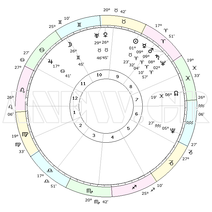 | | ΘΕΣΕΙΣ ΠΛΑΝΗΤΩΝ ΑΣΤΡΟΛΟΓΙΚΟΥ ΧΑΡΤΗ ΤΗΣ ΣΤΙΓΜΗΣ ΑΥΤΗΣ | | | | Πλανήτης | Ζώδιο | Μοίρες | Δεκαήμ. | Σε οίκο | Απόκλιση | | Ακμές των οίκων | | Ηλιος | Ταύρος | 01°20' | Πρώτο | 10 | 11 N 56 | | 1ος | 10°25' | Λέων | | Σελήνη | Δίδυμοι | 25°57' | Τρίτο | 11 | 28 N 12 | | 2ος | 02°17' | Παρθένος | | Ερμής | Κριός | 09°27' | Πρώτο | 9 | 01 N 22 | | 3ος | 28°45' | Παρθένος | | Αφροδίτη | Ταύρος | 26°41' | Τρίτο | 10 | 19 N 52 | | 4ος | 00°51' | Σκορπιός | | Αρης | Κριός | 09°01' | Πρώτο | 9 | 02 N 42 | | 5ος | 06°25' | Τοξότης | | Δίας | Καρκίνος | 17°41' | Δεύτερο | 12 | 22 N 39 | | 6ος | 10°31' | Αιγόκερως | | Κρόνος | Κριός | 08°09' | Πρώτο | 9 | 01 N 15 | | 7ος | 10°25' | Υδροχόος | | Ουρανός | Ταύρος | 29°45' | Τρίτο | 10 | 19 N 56 | | 8ος | 02°17' | Ιχθείς | | Ποσειδώνας | Κριός | 02°57' | Πρώτο | 9 | 00 S 02 | | 9ος | 28°45' | Ιχθείς | | Πλούτωνας | Υδροχόος | 05°27' | Πρώτο | 6 | 22 S 48 | | 10ος | 00°51' | Ταύρος | | Β. Δεσμός | Ιχθείς | 06°19' | Πρώτο | 8 | 09 S 11 | | 11ος | 06°25' | Δίδυμοι | | Ωροσκόπος | Λέων | 10°25' | Δεύτερο | | | 12ος | 10°31' | Καρκίνος | | Μεσουράνημα | Ταύρος | 00°51' | Πρώτο | | | |