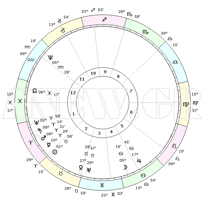 | | ΘΕΣΕΙΣ ΠΛΑΝΗΤΩΝ ΑΣΤΡΟΛΟΓΙΚΟΥ ΧΑΡΤΗ ΤΗΣ ΣΤΙΓΜΗΣ ΑΥΤΗΣ | | | | Πλανήτης | Ζώδιο | Μοίρες | Δεκαήμ. | Σε οίκο | Απόκλιση | | Ακμές των οίκων | | Ηλιος | Ταύρος | 01°54' | Πρώτο | 2 | 12 N 08 | | 1ος | 11°45' | Υδροχόος | | Σελήνη | Καρκίνος | 04°23' | Πρώτο | 5 | 27 N 54 | | 2ος | 27°15' | Ιχθείς | | Ερμής | Κριός | 10°23' | Δεύτερο | 2 | 01 N 44 | | 3ος | 03°36' | Ταύρος | | Αφροδίτη | Ταύρος | 27°23' | Τρίτο | 3 | 20 N 03 | | 4ος | 00°13' | Δίδυμοι | | Αρης | Κριός | 09°28' | Πρώτο | 2 | 02 N 53 | | 5ος | 22°18' | Δίδυμοι | | Δίας | Καρκίνος | 17°45' | Δεύτερο | 6 | 22 N 38 | | 6ος | 14°19' | Καρκίνος | | Κρόνος | Κριός | 08°13' | Πρώτο | 2 | 01 N 17 | | 7ος | 11°45' | Λέων | | Ουρανός | Ταύρος | 29°47' | Τρίτο | 3 | 19 N 56 | | 8ος | 27°15' | Παρθένος | | Ποσειδώνας | Κριός | 02°58' | Πρώτο | 2 | 00 S 02 | | 9ος | 03°36' | Σκορπιός | | Πλούτωνας | Υδροχόος | 05°28' | Πρώτο | 12 | 22 S 48 | | 10ος | 00°13' | Τοξότης | | Β. Δεσμός | Ιχθείς | 06°17' | Πρώτο | 1 | 09 S 12 | | 11ος | 22°18' | Τοξότης | | Ωροσκόπος | Υδροχόος | 11°45' | Δεύτερο | | | 12ος | 14°19' | Αιγόκερως | | Μεσουράνημα | Τοξότης | 00°13' | Πρώτο | | | |