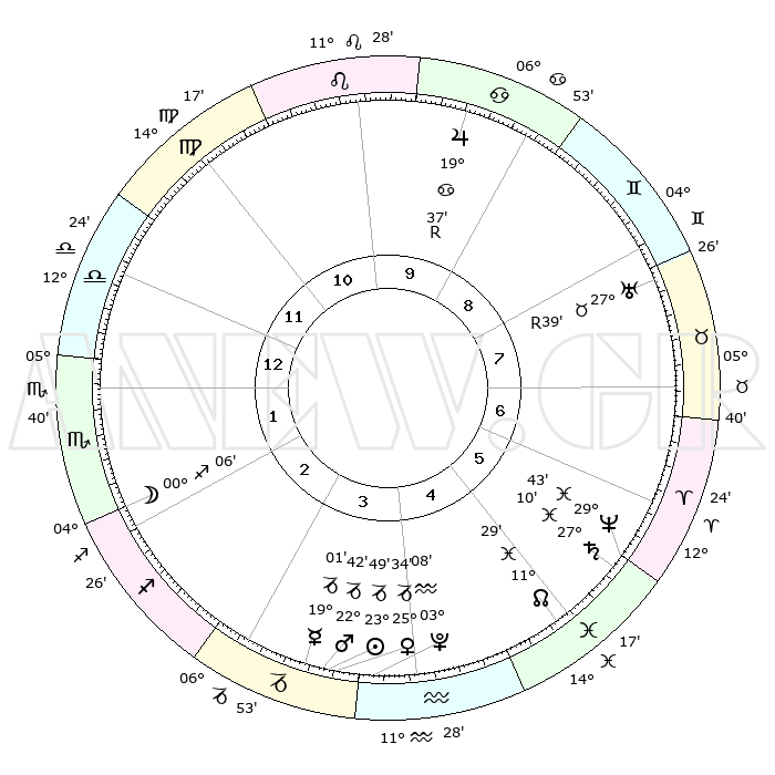 | | ΘΕΣΕΙΣ ΠΛΑΝΗΤΩΝ ΑΣΤΡΟΛΟΓΙΚΟΥ ΧΑΡΤΗ ΤΗΣ ΣΤΙΓΜΗΣ ΑΥΤΗΣ | | | | Πλανήτης | Ζώδιο | Μοίρες | Δεκαήμ. | Σε οίκο | Απόκλιση | | Ακμές των οίκων | | Ηλιος | Αιγόκερως | 23°44' | Τρίτο | 4 | 21 S 21 | | 1ος | 13°45' | Ζυγός | | Σελήνη | Σκορπιός | 29°13' | Τρίτο | 2 | 24 S 53 | | 2ος | 11°14' | Σκορπιός | | Ερμής | Αιγόκερως | 18°53' | Δεύτερο | 4 | 23 S 48 | | 3ος | 12°13' | Τοξότης | | Αφροδίτη | Αιγόκερως | 25°28' | Τρίτο | 4 | 21 S 58 | | 4ος | 15°32' | Αιγόκερως | | Αρης | Αιγόκερως | 22°39' | Τρίτο | 4 | 22 S 29 | | 5ος | 18°28' | Υδροχόος | | Δίας | Καρκίνος | 19°37'R | Δεύτερο | 10 | 22 N 16 | | 6ος | 18°18' | Ιχθείς | | Κρόνος | Ιχθείς | 27°10' | Τρίτο | 6 | 03 S 10 | | 7ος | 13°45' | Κριός | | Ουρανός | Ταύρος | 27°39'R | Τρίτο | 8 | 19 N 26 | | 8ος | 11°14' | Ταύρος | | Ποσειδώνας | Ιχθείς | 29°43' | Τρίτο | 6 | 01 S 20 | | 9ος | 12°13' | Δίδυμοι | | Πλούτωνας | Υδροχόος | 03°07' | Πρώτο | 4 | 23 S 08 | | 10ος | 15°32' | Καρκίνος | | Β. Δεσμός | Ιχθείς | 11°29' | Δεύτερο | 5 | 07 S 15 | | 11ος | 18°28' | Λέων | | Ωροσκόπος | Ζυγός | 13°45' | Δεύτερο | | | 12ος | 18°18' | Παρθένος | | Μεσουράνημα | Καρκίνος | 15°32' | Δεύτερο | | | |