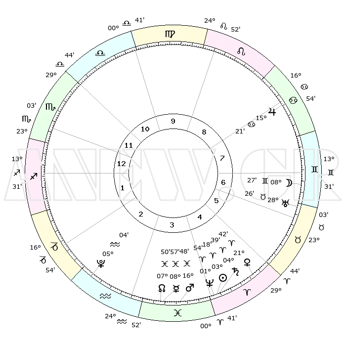 | | ΘΕΣΕΙΣ ΠΛΑΝΗΤΩΝ ΑΣΤΡΟΛΟΓΙΚΟΥ ΧΑΡΤΗ ΤΗΣ ΣΤΙΓΜΗΣ ΑΥΤΗΣ | | | | Πλανήτης | Ζώδιο | Μοίρες | Δεκαήμ. | Σε οίκο | Απόκλιση | | Ακμές των οίκων | | Ηλιος | Κριός | 03°14' | Πρώτο | 4 | 01 N 17 | | 1ος | 22°00' | Σκορπιός | | Σελήνη | Δίδυμοι | 07°24' | Πρώτο | 7 | 26 N 42 | | 2ος | 22°10' | Τοξότης | | Ερμής | Ιχθείς | 08°56' | Πρώτο | 4 | 07 S 58 | | 3ος | 26°36' | Αιγόκερως | | Αφροδίτη | Κριός | 21°37' | Τρίτο | 5 | 07 N 43 | | 4ος | 02°20' | Ιχθείς | | Αρης | Ιχθείς | 16°45' | Δεύτερο | 4 | 06 S 13 | | 5ος | 04°13' | Κριός | | Δίας | Καρκίνος | 15°21' | Δεύτερο | 8 | 22 N 55 | | 6ος | 00°21' | Ταύρος | | Κρόνος | Κριός | 04°39' | Πρώτο | 5 | 00 S 06 | | 7ος | 22°00' | Ταύρος | | Ουρανός | Ταύρος | 28°26' | Τρίτο | 7 | 19 N 38 | | 8ος | 22°10' | Δίδυμοι | | Ποσειδώνας | Κριός | 01°54' | Πρώτο | 4 | 00 S 27 | | 9ος | 26°36' | Καρκίνος | | Πλούτωνας | Υδροχόος | 05°04' | Πρώτο | 3 | 22 S 48 | | 10ος | 02°20' | Παρθένος | | Β. Δεσμός | Ιχθείς | 07°50' | Πρώτο | 4 | 08 S 38 | | 11ος | 04°13' | Ζυγός | | Ωροσκόπος | Σκορπιός | 22°00' | Τρίτο | | | 12ος | 00°21' | Σκορπιός | | Μεσουράνημα | Παρθένος | 02°20' | Πρώτο | | | |