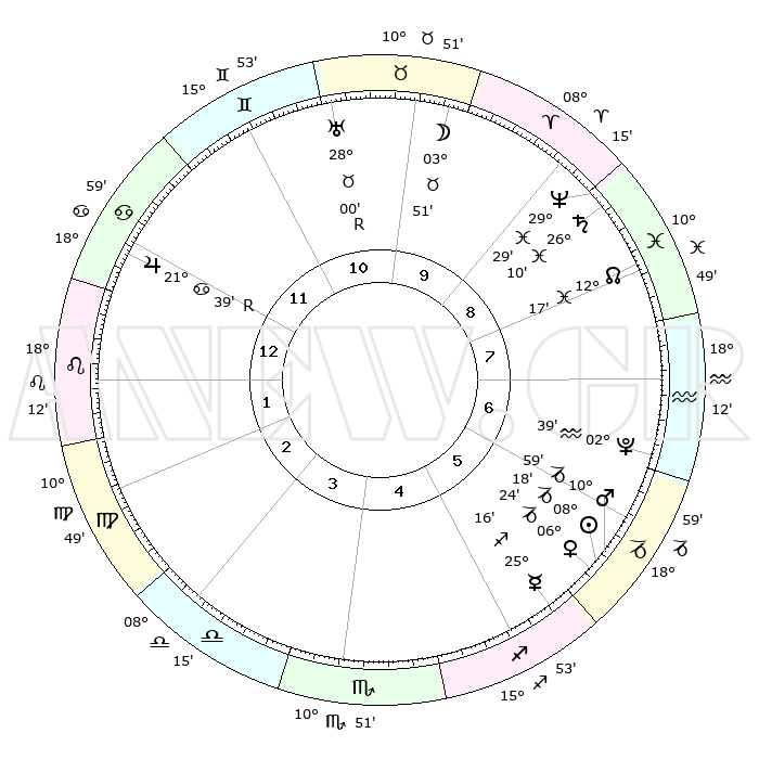 | | ΘΕΣΕΙΣ ΠΛΑΝΗΤΩΝ ΑΣΤΡΟΛΟΓΙΚΟΥ ΧΑΡΤΗ ΤΗΣ ΣΤΙΓΜΗΣ ΑΥΤΗΣ | | | | Πλανήτης | Ζώδιο | Μοίρες | Δεκαήμ. | Σε οίκο | Απόκλιση | | Ακμές των οίκων | | Ηλιος | Αιγόκερως | 08°13' | Πρώτο | 6 | 23 S 11 | | 1ος | 26°11' | Καρκίνος | | Σελήνη | Ταύρος | 02°46' | Πρώτο | 10 | 16 N 10 | | 2ος | 16°60' | Λέων | | Ερμής | Τοξότης | 25°09' | Τρίτο | 6 | 23 S 39 | | 3ος | 11°32' | Παρθένος | | Αφροδίτη | Αιγόκερως | 06°19' | Πρώτο | 6 | 23 S 42 | | 4ος | 12°04' | Ζυγός | | Αρης | Αιγόκερως | 10°56' | Δεύτερο | 6 | 23 S 51 | | 5ος | 18°10' | Σκορπιός | | Δίας | Καρκίνος | 21°39'R | Τρίτο | 12 | 21 N 55 | | 6ος | 24°30' | Τοξότης | | Κρόνος | Ιχθείς | 26°09' | Τρίτο | 9 | 03 S 37 | | 7ος | 26°11' | Αιγόκερως | | Ουρανός | Ταύρος | 28°01'R | Τρίτο | 11 | 19 N 31 | | 8ος | 16°60' | Υδροχόος | | Ποσειδώνας | Ιχθείς | 29°29' | Τρίτο | 9 | 01 S 26 | | 9ος | 11°32' | Ιχθείς | | Πλούτωνας | Υδροχόος | 02°39' | Πρώτο | 7 | 23 S 14 | | 10ος | 12°04' | Κριός | | Β. Δεσμός | Ιχθείς | 12°17' | Δεύτερο | 9 | 06 S 57 | | 11ος | 18°10' | Ταύρος | | Ωροσκόπος | Καρκίνος | 26°11' | Τρίτο | | | 12ος | 24°30' | Δίδυμοι | | Μεσουράνημα | Κριός | 12°04' | Δεύτερο | | | |