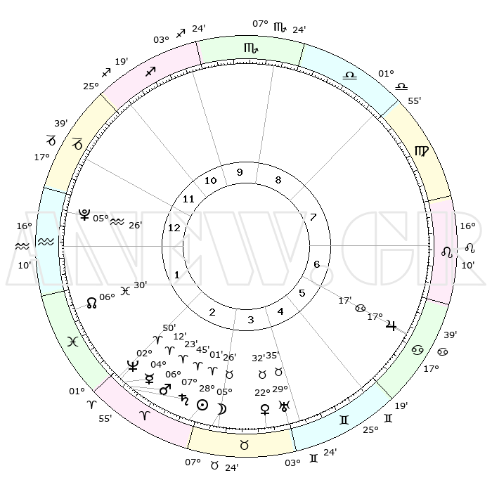 | | ΘΕΣΕΙΣ ΠΛΑΝΗΤΩΝ ΑΣΤΡΟΛΟΓΙΚΟΥ ΧΑΡΤΗ ΤΗΣ ΣΤΙΓΜΗΣ ΑΥΤΗΣ | | | | Πλανήτης | Ζώδιο | Μοίρες | Δεκαήμ. | Σε οίκο | Απόκλιση | | Ακμές των οίκων | | Ηλιος | Κριός | 27°57' | Τρίτο | 3 | 10 N 45 | | 1ος | 18°30' | Αιγόκερως | | Σελήνη | Ταύρος | 04°29' | Πρώτο | 3 | 17 N 02 | | 2ος | 00°18' | Ιχθείς | | Ερμής | Κριός | 04°06' | Πρώτο | 2 | 00 S 47 | | 3ος | 10°10' | Κριός | | Αφροδίτη | Ταύρος | 22°27' | Τρίτο | 4 | 18 N 41 | | 4ος | 10°44' | Ταύρος | | Αρης | Κριός | 06°20' | Πρώτο | 2 | 01 N 38 | | 5ος | 04°32' | Δίδυμοι | | Δίας | Καρκίνος | 17°17' | Δεύτερο | 6 | 22 N 42 | | 6ος | 25°44' | Δίδυμοι | | Κρόνος | Κριός | 07°45' | Πρώτο | 2 | 01 N 06 | | 7ος | 18°30' | Καρκίνος | | Ουρανός | Ταύρος | 29°35' | Τρίτο | 4 | 19 N 53 | | 8ος | 00°18' | Παρθένος | | Ποσειδώνας | Κριός | 02°50' | Πρώτο | 2 | 00 S 05 | | 9ος | 10°10' | Ζυγός | | Πλούτωνας | Υδροχόος | 05°26' | Πρώτο | 1 | 22 S 47 | | 10ος | 10°43' | Σκορπιός | | Β. Δεσμός | Ιχθείς | 06°30' | Πρώτο | 2 | 09 S 07 | | 11ος | 04°32' | Τοξότης | | Ωροσκόπος | Αιγόκερως | 18°30' | Δεύτερο | | | 12ος | 25°44' | Τοξότης | | Μεσουράνημα | Σκορπιός | 10°43' | Δεύτερο | | | |