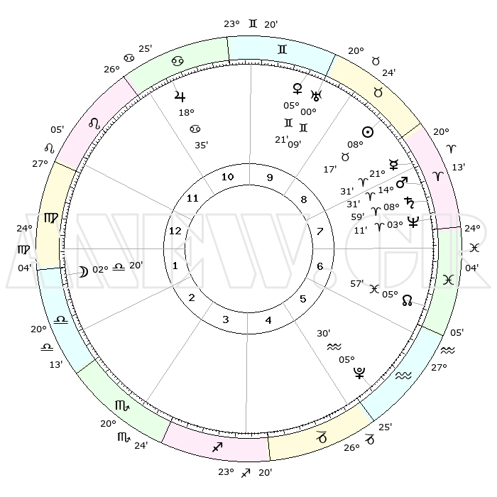 | | ΘΕΣΕΙΣ ΠΛΑΝΗΤΩΝ ΑΣΤΡΟΛΟΓΙΚΟΥ ΧΑΡΤΗ ΤΗΣ ΣΤΙΓΜΗΣ ΑΥΤΗΣ | | | | Πλανήτης | Ζώδιο | Μοίρες | Δεκαήμ. | Σε οίκο | Απόκλιση | | Ακμές των οίκων | | Ηλιος | Ταύρος | 08°13' | Πρώτο | 9 | 14 N 15 | | 1ος | 05°55' | Παρθένος | | Σελήνη | Ζυγός | 01°34' | Πρώτο | 2 | 02 S 32 | | 2ος | 00°23' | Ζυγός | | Ερμής | Κριός | 21°25' | Τρίτο | 8 | 06 N 20 | | 3ος | 29°33' | Ζυγός | | Αφροδίτη | Δίδυμοι | 05°16' | Πρώτο | 10 | 21 N 57 | | 4ος | 02°30' | Τοξότης | | Αρης | Κριός | 14°28' | Δεύτερο | 8 | 04 N 52 | | 5ος | 06°19' | Αιγόκερως | | Δίας | Καρκίνος | 18°35' | Δεύτερο | 11 | 22 N 32 | | 6ος | 07°51' | Υδροχόος | | Κρόνος | Κριός | 08°59' | Πρώτο | 8 | 01 N 34 | | 7ος | 05°55' | Ιχθείς | | Ουρανός | Δίδυμοι | 00°08' | Πρώτο | 9 | 20 N 01 | | 8ος | 00°23' | Κριός | | Ποσειδώνας | Κριός | 03°11' | Πρώτο | 8 | 00 N 03 | | 9ος | 29°33' | Κριός | | Πλούτωνας | Υδροχόος | 05°30' | Πρώτο | 5 | 22 S 48 | | 10ος | 02°30' | Δίδυμοι | | Β. Δεσμός | Ιχθείς | 05°57' | Πρώτο | 7 | 09 S 20 | | 11ος | 06°19' | Καρκίνος | | Ωροσκόπος | Παρθένος | 05°55' | Πρώτο | | | 12ος | 07°51' | Λέων | | Μεσουράνημα | Δίδυμοι | 02°30' | Πρώτο | | | |