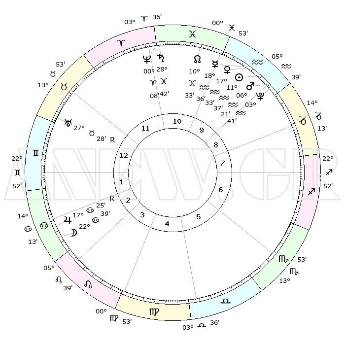 | | ΘΕΣΕΙΣ ΠΛΑΝΗΤΩΝ ΑΣΤΡΟΛΟΓΙΚΟΥ ΧΑΡΤΗ ΤΗΣ ΣΤΙΓΜΗΣ ΑΥΤΗΣ | | | | Πλανήτης | Ζώδιο | Μοίρες | Δεκαήμ. | Σε οίκο | Απόκλιση | | Ακμές των οίκων | | Ηλιος | Υδροχόος | 11°33' | Δεύτερο | 10 | 17 S 19 | | 1ος | 27°15' | Ταύρος | | Σελήνη | Καρκίνος | 21°42' | Τρίτο | 3 | 25 N 29 | | 2ος | 22°38' | Δίδυμοι | | Ερμής | Υδροχόος | 18°29' | Δεύτερο | 10 | 17 S 06 | | 3ος | 14°09' | Καρκίνος | | Αφροδίτη | Υδροχόος | 17°28' | Δεύτερο | 10 | 16 S 53 | | 4ος | 06°43' | Λέων | | Αρης | Υδροχόος | 06°18' | Πρώτο | 9 | 19 S 42 | | 5ος | 04°43' | Παρθένος | | Δίας | Καρκίνος | 17°25'R | Δεύτερο | 3 | 22 N 36 | | 6ος | 12°43' | Ζυγός | | Κρόνος | Ιχθείς | 28°42' | Τρίτο | 11 | 02 S 31 | | 7ος | 27°15' | Σκορπιός | | Ουρανός | Ταύρος | 27°28'R | Τρίτο | 1 | 19 N 24 | | 8ος | 22°38' | Τοξότης | | Ποσειδώνας | Κριός | 00°08' | Πρώτο | 11 | 01 S 09 | | 9ος | 14°09' | Αιγόκερως | | Πλούτωνας | Υδροχόος | 03°41' | Πρώτο | 9 | 23 S 01 | | 10ος | 06°43' | Υδροχόος | | Β. Δεσμός | Ιχθείς | 10°33' | Δεύτερο | 11 | 07 S 36 | | 11ος | 04°43' | Ιχθείς | | Ωροσκόπος | Ταύρος | 27°15' | Τρίτο | | | 12ος | 12°43' | Κριός | | Μεσουράνημα | Υδροχόος | 06°43' | Πρώτο | | | |