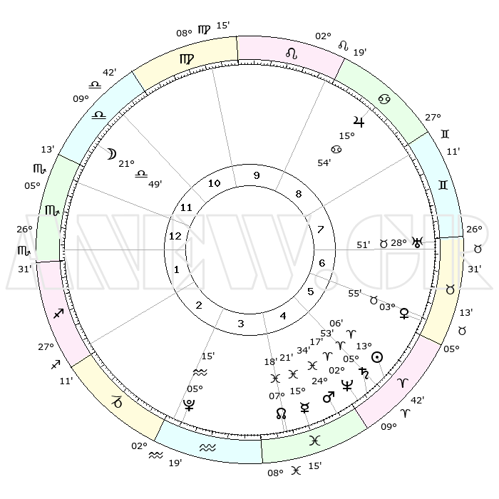 | | ΘΕΣΕΙΣ ΠΛΑΝΗΤΩΝ ΑΣΤΡΟΛΟΓΙΚΟΥ ΧΑΡΤΗ ΤΗΣ ΣΤΙΓΜΗΣ ΑΥΤΗΣ | | | | Πλανήτης | Ζώδιο | Μοίρες | Δεκαήμ. | Σε οίκο | Απόκλιση | | Ακμές των οίκων | | Ηλιος | Κριός | 13°03' | Δεύτερο | 5 | 05 N 09 | | 1ος | 10°25' | Σκορπιός | | Σελήνη | Ζυγός | 21°08' | Τρίτο | 12 | 11 S 29 | | 2ος | 09°31' | Τοξότης | | Ερμής | Ιχθείς | 15°18' | Δεύτερο | 4 | 07 S 14 | | 3ος | 12°27' | Αιγόκερως | | Αφροδίτη | Ταύρος | 03°51' | Πρώτο | 6 | 12 N 27 | | 4ος | 17°24' | Υδροχόος | | Αρης | Ιχθείς | 24°32' | Τρίτο | 5 | 03 S 08 | | 5ος | 20°03' | Ιχθείς | | Δίας | Καρκίνος | 15°54' | Δεύτερο | 9 | 22 N 51 | | 6ος | 17°39' | Κριός | | Κρόνος | Κριός | 05°53' | Πρώτο | 5 | 00 N 23 | | 7ος | 10°25' | Ταύρος | | Ουρανός | Ταύρος | 28°51' | Τρίτο | 7 | 19 N 44 | | 8ος | 09°31' | Δίδυμοι | | Ποσειδώνας | Κριός | 02°17' | Πρώτο | 5 | 00 S 18 | | 9ος | 12°27' | Καρκίνος | | Πλούτωνας | Υδροχόος | 05°15' | Πρώτο | 3 | 22 S 47 | | 10ος | 17°24' | Λέων | | Β. Δεσμός | Ιχθείς | 07°18' | Πρώτο | 4 | 08 S 49 | | 11ος | 20°03' | Παρθένος | | Ωροσκόπος | Σκορπιός | 10°25' | Δεύτερο | | | 12ος | 17°39' | Ζυγός | | Μεσουράνημα | Λέων | 17°24' | Δεύτερο | | | |