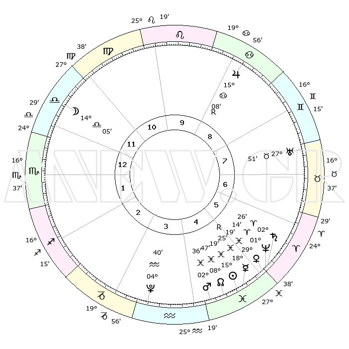 | | ΘΕΣΕΙΣ ΠΛΑΝΗΤΩΝ ΑΣΤΡΟΛΟΓΙΚΟΥ ΧΑΡΤΗ ΤΗΣ ΣΤΙΓΜΗΣ ΑΥΤΗΣ | | | | Πλανήτης | Ζώδιο | Μοίρες | Δεκαήμ. | Σε οίκο | Απόκλιση | | Ακμές των οίκων | | Ηλιος | Ιχθείς | 15°15' | Δεύτερο | 5 | 05 S 49 | | 1ος | 28°42' | Ζυγός | | Σελήνη | Ζυγός | 13°18' | Δεύτερο | 12 | 07 S 59 | | 2ος | 27°02' | Σκορπιός | | Ερμής | Ιχθείς | 18°29'R | Δεύτερο | 5 | 01 S 09 | | 3ος | 28°53' | Τοξότης | | Αφροδίτη | Ιχθείς | 29°14' | Τρίτο | 5 | 01 S 28 | | 4ος | 02°60' | Υδροχόος | | Αρης | Ιχθείς | 02°33' | Πρώτο | 4 | 11 S 35 | | 5ος | 05°55' | Ιχθείς | | Δίας | Καρκίνος | 15°08'R | Δεύτερο | 9 | 22 N 55 | | 6ος | 04°43' | Κριός | | Κρόνος | Κριός | 02°25' | Πρώτο | 5 | 01 S 00 | | 7ος | 28°42' | Κριός | | Ουρανός | Ταύρος | 27°51' | Τρίτο | 8 | 19 N 30 | | 8ος | 27°02' | Ταύρος | | Ποσειδώνας | Κριός | 01°14' | Πρώτο | 5 | 00 S 43 | | 9ος | 28°53' | Δίδυμοι | | Πλούτωνας | Υδροχόος | 04°40' | Πρώτο | 4 | 22 S 51 | | 10ος | 02°60' | Λέων | | Β. Δεσμός | Ιχθείς | 08°47' | Πρώτο | 5 | 08 S 16 | | 11ος | 05°55' | Παρθένος | | Ωροσκόπος | Ζυγός | 28°42' | Τρίτο | | | 12ος | 04°43' | Ζυγός | | Μεσουράνημα | Λέων | 02°60' | Πρώτο | | | |
