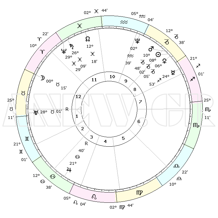| | ΘΕΣΕΙΣ ΠΛΑΝΗΤΩΝ ΑΣΤΡΟΛΟΓΙΚΟΥ ΧΑΡΤΗ ΤΗΣ ΣΤΙΓΜΗΣ ΑΥΤΗΣ | | | | Πλανήτης | Ζώδιο | Μοίρες | Δεκαήμ. | Σε οίκο | Απόκλιση | | Ακμές των οίκων | | Ηλιος | Αιγόκερως | 07°58' | Πρώτο | 9 | 23 S 12 | | 1ος | 18°21' | Κριός | | Σελήνη | Κριός | 29°13' | Τρίτο | 1 | 14 N 43 | | 2ος | 23°49' | Ταύρος | | Ερμής | Τοξότης | 24°47' | Τρίτο | 9 | 23 S 37 | | 3ος | 18°41' | Δίδυμοι | | Αφροδίτη | Αιγόκερως | 06°00' | Πρώτο | 9 | 23 S 42 | | 4ος | 10°26' | Καρκίνος | | Αρης | Αιγόκερως | 10°44' | Δεύτερο | 10 | 23 S 52 | | 5ος | 03°50' | Λέων | | Δίας | Καρκίνος | 21°41'R | Τρίτο | 4 | 21 N 55 | | 6ος | 04°19' | Παρθένος | | Κρόνος | Ιχθείς | 26°09' | Τρίτο | 12 | 03 S 37 | | 7ος | 18°21' | Ζυγός | | Ουρανός | Ταύρος | 28°01'R | Τρίτο | 2 | 19 N 31 | | 8ος | 23°49' | Σκορπιός | | Ποσειδώνας | Ιχθείς | 29°29' | Τρίτο | 12 | 01 S 26 | | 9ος | 18°41' | Τοξότης | | Πλούτωνας | Υδροχόος | 02°39' | Πρώτο | 10 | 23 S 14 | | 10ος | 10°26' | Αιγόκερως | | Β. Δεσμός | Ιχθείς | 12°18' | Δεύτερο | 12 | 06 S 57 | | 11ος | 03°50' | Υδροχόος | | Ωροσκόπος | Κριός | 18°21' | Δεύτερο | | | 12ος | 04°19' | Ιχθείς | | Μεσουράνημα | Αιγόκερως | 10°26' | Δεύτερο | | | |