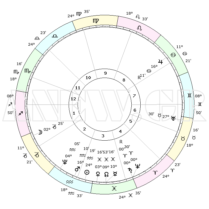 | | ΘΕΣΕΙΣ ΠΛΑΝΗΤΩΝ ΑΣΤΡΟΛΟΓΙΚΟΥ ΧΑΡΤΗ ΤΗΣ ΣΤΙΓΜΗΣ ΑΥΤΗΣ | | | | Πλανήτης | Ζώδιο | Μοίρες | Δεκαήμ. | Σε οίκο | Απόκλιση | | Ακμές των οίκων | | Ηλιος | Υδροχόος | 24°14' | Τρίτο | 3 | 13 S 26 | | 1ος | 18°31' | Σκορπιός | | Σελήνη | Αιγόκερως | 01°35' | Πρώτο | 2 | 28 S 17 | | 2ος | 18°19' | Τοξότης | | Ερμής | Ιχθείς | 10°09' | Δεύτερο | 4 | 08 S 06 | | 3ος | 22°16' | Αιγόκερως | | Αφροδίτη | Ιχθείς | 03°10' | Πρώτο | 4 | 11 S 42 | | 4ος | 27°47' | Υδροχόος | | Αρης | Υδροχόος | 16°07' | Δεύτερο | 3 | 17 S 02 | | 5ος | 29°58' | Ιχθείς | | Δίας | Καρκίνος | 16°11'R | Δεύτερο | 8 | 22 N 46 | | 6ος | 26°33' | Κριός | | Κρόνος | | 00°00' | Πρώτο | 5 | 01 S 58 | | 7ος | 18°31' | Ταύρος | | Ουρανός | Ταύρος | 27°30' | Τρίτο | 7 | 19 N 25 | | 8ος | 18°19' | Δίδυμοι | | Ποσειδώνας | Κριός | 00°30' | Πρώτο | 5 | 01 S 00 | | 9ος | 22°16' | Καρκίνος | | Πλούτωνας | Υδροχόος | 04°04' | Πρώτο | 3 | 22 S 57 | | 10ος | 27°47' | Λέων | | Β. Δεσμός | Ιχθείς | 09°54' | Πρώτο | 4 | 07 S 51 | | 11ος | 29°58' | Παρθένος | | Ωροσκόπος | Σκορπιός | 18°31' | Δεύτερο | | | 12ος | 26°33' | Ζυγός | | Μεσουράνημα | Λέων | 27°47' | Τρίτο | | | |