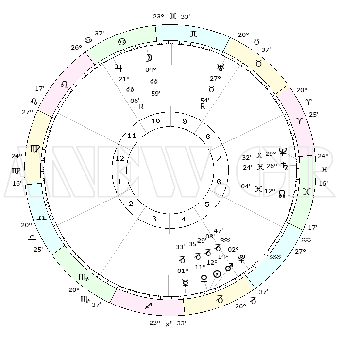 | | ΘΕΣΕΙΣ ΠΛΑΝΗΤΩΝ ΑΣΤΡΟΛΟΓΙΚΟΥ ΧΑΡΤΗ ΤΗΣ ΣΤΙΓΜΗΣ ΑΥΤΗΣ | | | | Πλανήτης | Ζώδιο | Μοίρες | Δεκαήμ. | Σε οίκο | Απόκλιση | | Ακμές των οίκων | | Ηλιος | Αιγόκερως | 12°25' | Δεύτερο | 5 | 22 S 51 | | 1ος | 02°03' | Παρθένος | | Σελήνη | Καρκίνος | 03°51' | Πρώτο | 11 | 28 N 02 | | 2ος | 26°07' | Παρθένος | | Ερμής | Αιγόκερως | 01°26' | Πρώτο | 4 | 24 S 11 | | 3ος | 24°58' | Ζυγός | | Αφροδίτη | Αιγόκερως | 11°29' | Δεύτερο | 5 | 23 S 30 | | 4ος | 27°55' | Σκορπιός | | Αρης | Αιγόκερως | 14°05' | Δεύτερο | 5 | 23 S 35 | | 5ος | 01°58' | Αιγόκερως | | Δίας | Καρκίνος | 21°07'R | Τρίτο | 11 | 22 N 01 | | 6ος | 03°46' | Υδροχόος | | Κρόνος | Ιχθείς | 26°24' | Τρίτο | 8 | 03 S 30 | | 7ος | 02°03' | Ιχθείς | | Ουρανός | Ταύρος | 27°54'R | Τρίτο | 9 | 19 N 30 | | 8ος | 26°07' | Ιχθείς | | Ποσειδώνας | Ιχθείς | 29°32' | Τρίτο | 8 | 01 S 24 | | 9ος | 24°59' | Κριός | | Πλούτωνας | Υδροχόος | 02°47' | Πρώτο | 5 | 23 S 12 | | 10ος | 27°55' | Ταύρος | | Β. Δεσμός | Ιχθείς | 12°04' | Δεύτερο | 7 | 07 S 02 | | 11ος | 01°58' | Καρκίνος | | Ωροσκόπος | Παρθένος | 02°03' | Πρώτο | | | 12ος | 03°46' | Λέων | | Μεσουράνημα | Ταύρος | 27°55' | Τρίτο | | | |