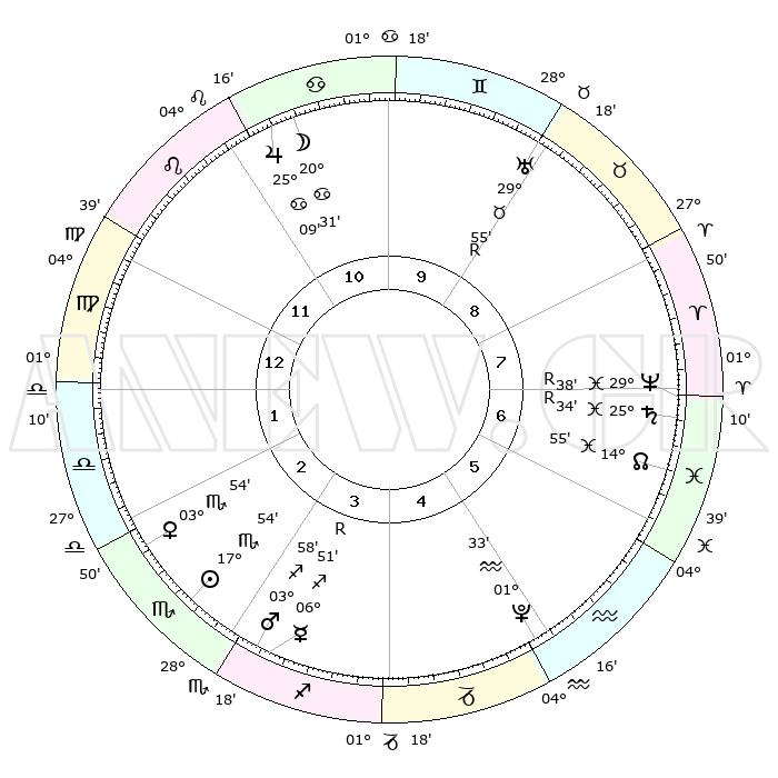 | | ΘΕΣΕΙΣ ΠΛΑΝΗΤΩΝ ΑΣΤΡΟΛΟΓΙΚΟΥ ΧΑΡΤΗ ΤΗΣ ΣΤΙΓΜΗΣ ΑΥΤΗΣ | | | | Πλανήτης | Ζώδιο | Μοίρες | Δεκαήμ. | Σε οίκο | Απόκλιση | | Ακμές των οίκων | | Ηλιος | Σκορπιός | 17°49' | Δεύτερο | 3 | 17 S 08 | | 1ος | 08°17' | Παρθένος | | Σελήνη | Καρκίνος | 19°25' | Δεύτερο | 11 | 26 N 14 | | 2ος | 02°59' | Ζυγός | | Ερμής | Τοξότης | 06°52'R | Πρώτο | 4 | 23 S 45 | | 3ος | 02°19' | Σκορπιός | | Αφροδίτη | Σκορπιός | 03°48' | Πρώτο | 3 | 11 S 32 | | 4ος | 05°16' | Τοξότης | | Αρης | Τοξότης | 03°55' | Πρώτο | 3 | 21 S 24 | | 5ος | 08°57' | Αιγόκερως | | Δίας | Καρκίνος | 25°09' | Τρίτο | 11 | 21 N 12 | | 6ος | 10°20' | Υδροχόος | | Κρόνος | Ιχθείς | 25°35'R | Τρίτο | 7 | 04 S 00 | | 7ος | 08°16' | Ιχθείς | | Ουρανός | Ταύρος | 29°55'R | Τρίτο | 9 | 19 N 55 | | 8ος | 02°59' | Κριός | | Ποσειδώνας | Ιχθείς | 29°38'R | Τρίτο | 7 | 01 S 24 | | 9ος | 02°19' | Ταύρος | | Πλούτωνας | Υδροχόος | 01°32' | Πρώτο | 5 | 23 S 29 | | 10ος | 05°16' | Δίδυμοι | | Β. Δεσμός | Ιχθείς | 14°55' | Δεύτερο | 7 | 05 S 56 | | 11ος | 08°57' | Καρκίνος | | Ωροσκόπος | Παρθένος | 08°17' | Πρώτο | | | 12ος | 10°20' | Λέων | | Μεσουράνημα | Δίδυμοι | 05°16' | Πρώτο | | | |