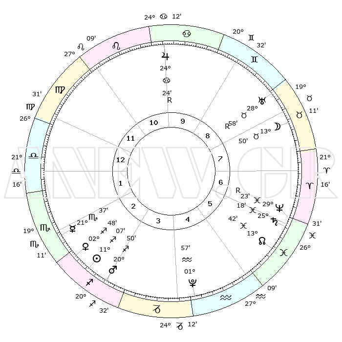| | ΘΕΣΕΙΣ ΠΛΑΝΗΤΩΝ ΑΣΤΡΟΛΟΓΙΚΟΥ ΧΑΡΤΗ ΤΗΣ ΣΤΙΓΜΗΣ ΑΥΤΗΣ | | | | Πλανήτης | Ζώδιο | Μοίρες | Δεκαήμ. | Σε οίκο | Απόκλιση | | Ακμές των οίκων | | Ηλιος | Τοξότης | 11°06' | Δεύτερο | 2 | 22 S 06 | | 1ος | 14°33' | Ζυγός | | Σελήνη | Ταύρος | 13°29' | Δεύτερο | 8 | 19 N 59 | | 2ος | 12°04' | Σκορπιός | | Ερμής | Σκορπιός | 21°36' | Τρίτο | 2 | 15 S 38 | | 3ος | 13°05' | Τοξότης | | Αφροδίτη | Τοξότης | 02°46' | Πρώτο | 2 | 20 S 05 | | 4ος | 16°26' | Αιγόκερως | | Αρης | Τοξότης | 20°49' | Τρίτο | 3 | 23 S 48 | | 5ος | 19°22' | Υδροχόος | | Δίας | Καρκίνος | 24°24'R | Τρίτο | 10 | 21 N 24 | | 6ος | 19°09' | Ιχθείς | | Κρόνος | Ιχθείς | 25°18' | Τρίτο | 6 | 04 S 02 | | 7ος | 14°33' | Κριός | | Ουρανός | Ταύρος | 28°58'R | Τρίτο | 8 | 19 N 43 | | 8ος | 12°04' | Ταύρος | | Ποσειδώνας | Ιχθείς | 29°23'R | Τρίτο | 6 | 01 S 29 | | 9ος | 13°05' | Δίδυμοι | | Πλούτωνας | Υδροχόος | 01°57' | Πρώτο | 4 | 23 S 23 | | 10ος | 16°26' | Καρκίνος | | Β. Δεσμός | Ιχθείς | 13°42' | Δεύτερο | 5 | 06 S 24 | | 11ος | 19°22' | Λέων | | Ωροσκόπος | Ζυγός | 14°33' | Δεύτερο | | | 12ος | 19°09' | Παρθένος | | Μεσουράνημα | Καρκίνος | 16°26' | Δεύτερο | | | |