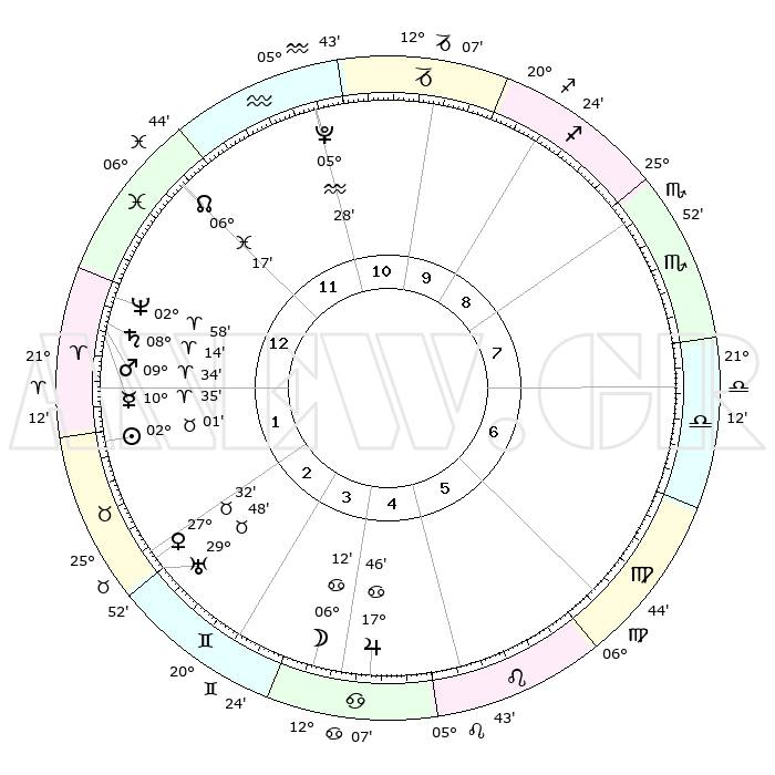| | ΘΕΣΕΙΣ ΠΛΑΝΗΤΩΝ ΑΣΤΡΟΛΟΓΙΚΟΥ ΧΑΡΤΗ ΤΗΣ ΣΤΙΓΜΗΣ ΑΥΤΗΣ | | | | Πλανήτης | Ζώδιο | Μοίρες | Δεκαήμ. | Σε οίκο | Απόκλιση | | Ακμές των οίκων | | Ηλιος | Ταύρος | 01°58' | Πρώτο | 2 | 12 N 09 | | 1ος | 12°46' | Ιχθείς | | Σελήνη | Καρκίνος | 05°15' | Πρώτο | 4 | 27 N 50 | | 2ος | 26°37' | Κριός | | Ερμής | Κριός | 10°28' | Δεύτερο | 1 | 01 N 47 | | 3ος | 26°54' | Ταύρος | | Αφροδίτη | Ταύρος | 27°27' | Τρίτο | 3 | 20 N 04 | | 4ος | 20°13' | Δίδυμοι | | Αρης | Κριός | 09°31' | Πρώτο | 1 | 02 N 54 | | 5ος | 11°59' | Καρκίνος | | Δίας | Καρκίνος | 17°45' | Δεύτερο | 5 | 22 N 38 | | 6ος | 06°60' | Λέων | | Κρόνος | Κριός | 08°14' | Πρώτο | 1 | 01 N 17 | | 7ος | 12°46' | Παρθένος | | Ουρανός | Ταύρος | 29°47' | Τρίτο | 3 | 19 N 56 | | 8ος | 26°37' | Ζυγός | | Ποσειδώνας | Κριός | 02°58' | Πρώτο | 1 | 00 S 02 | | 9ος | 26°54' | Σκορπιός | | Πλούτωνας | Υδροχόος | 05°28' | Πρώτο | 11 | 22 S 48 | | 10ος | 20°13' | Τοξότης | | Β. Δεσμός | Ιχθείς | 06°17' | Πρώτο | 12 | 09 S 12 | | 11ος | 11°59' | Αιγόκερως | | Ωροσκόπος | Ιχθείς | 12°46' | Δεύτερο | | | 12ος | 06°60' | Υδροχόος | | Μεσουράνημα | Τοξότης | 20°13' | Τρίτο | | | |