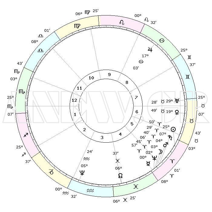 | | ΘΕΣΕΙΣ ΠΛΑΝΗΤΩΝ ΑΣΤΡΟΛΟΓΙΚΟΥ ΧΑΡΤΗ ΤΗΣ ΣΤΙΓΜΗΣ ΑΥΤΗΣ | | | | Πλανήτης | Ζώδιο | Μοίρες | Δεκαήμ. | Σε οίκο | Απόκλιση | | Ακμές των οίκων | | Ηλιος | Κριός | 25°47' | Τρίτο | 6 | 09 N 58 | | 1ος | 07°25' | Σκορπιός | | Σελήνη | Κριός | 02°15' | Πρώτο | 5 | 02 N 50 | | 2ος | 06°18' | Τοξότης | | Ερμής | Κριός | 00°52' | Πρώτο | 5 | 02 S 03 | | 3ος | 08°56' | Αιγόκερως | | Αφροδίτη | Ταύρος | 19°44' | Δεύτερο | 7 | 17 N 52 | | 4ος | 13°39' | Υδροχόος | | Αρης | Κριός | 04°37' | Πρώτο | 5 | 00 N 56 | | 5ος | 16°25' | Ιχθείς | | Δίας | Καρκίνος | 17°03' | Δεύτερο | 9 | 22 N 43 | | 6ος | 14°20' | Κριός | | Κρόνος | Κριός | 07°28' | Πρώτο | 5 | 01 N 00 | | 7ος | 07°25' | Ταύρος | | Ουρανός | Ταύρος | 29°28' | Τρίτο | 7 | 19 N 52 | | 8ος | 06°18' | Δίδυμοι | | Ποσειδώνας | Κριός | 02°45' | Πρώτο | 5 | 00 S 07 | | 9ος | 08°56' | Καρκίνος | | Πλούτωνας | Υδροχόος | 05°24' | Πρώτο | 3 | 22 S 47 | | 10ος | 13°39' | Λέων | | Β. Δεσμός | Ιχθείς | 06°37' | Πρώτο | 4 | 09 S 05 | | 11ος | 16°25' | Παρθένος | | Ωροσκόπος | Σκορπιός | 07°25' | Πρώτο | | | 12ος | 14°20' | Ζυγός | | Μεσουράνημα | Λέων | 13°39' | Δεύτερο | | | |
