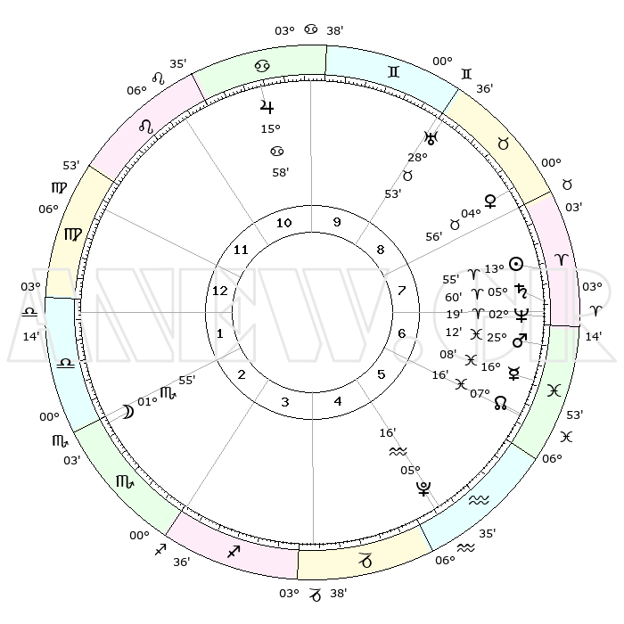 | | ΘΕΣΕΙΣ ΠΛΑΝΗΤΩΝ ΑΣΤΡΟΛΟΓΙΚΟΥ ΧΑΡΤΗ ΤΗΣ ΣΤΙΓΜΗΣ ΑΥΤΗΣ | | | | Πλανήτης | Ζώδιο | Μοίρες | Δεκαήμ. | Σε οίκο | Απόκλιση | | Ακμές των οίκων | | Ηλιος | Κριός | 13°51' | Δεύτερο | 8 | 05 N 28 | | 1ος | 14°12' | Παρθένος | | Σελήνη | Σκορπιός | 01°07' | Πρώτο | 2 | 15 S 42 | | 2ος | 09°29' | Ζυγός | | Ερμής | Ιχθείς | 16°04' | Δεύτερο | 7 | 07 S 02 | | 3ος | 09°11' | Σκορπιός | | Αφροδίτη | Ταύρος | 04°51' | Πρώτο | 8 | 12 N 49 | | 4ος | 12°08' | Τοξότης | | Αρης | Ιχθείς | 25°09' | Τρίτο | 7 | 02 S 52 | | 5ος | 15°32' | Αιγόκερως | | Δίας | Καρκίνος | 15°58' | Δεύτερο | 11 | 22 N 51 | | 6ος | 16°36' | Υδροχόος | | Κρόνος | Κριός | 05°59' | Πρώτο | 7 | 00 N 25 | | 7ος | 14°12' | Ιχθείς | | Ουρανός | Ταύρος | 28°53' | Τρίτο | 9 | 19 N 44 | | 8ος | 09°29' | Κριός | | Ποσειδώνας | Κριός | 02°18' | Πρώτο | 7 | 00 S 17 | | 9ος | 09°11' | Ταύρος | | Πλούτωνας | Υδροχόος | 05°15' | Πρώτο | 5 | 22 S 47 | | 10ος | 12°08' | Δίδυμοι | | Β. Δεσμός | Ιχθείς | 07°16' | Πρώτο | 6 | 08 S 50 | | 11ος | 15°32' | Καρκίνος | | Ωροσκόπος | Παρθένος | 14°12' | Δεύτερο | | | 12ος | 16°36' | Λέων | | Μεσουράνημα | Δίδυμοι | 12°08' | Δεύτερο | | | |