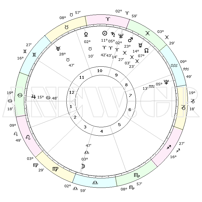 | | ΘΕΣΕΙΣ ΠΛΑΝΗΤΩΝ ΑΣΤΡΟΛΟΓΙΚΟΥ ΧΑΡΤΗ ΤΗΣ ΣΤΙΓΜΗΣ ΑΥΤΗΣ | | | | Πλανήτης | Ζώδιο | Μοίρες | Δεκαήμ. | Σε οίκο | Απόκλιση | | Ακμές των οίκων | | Ηλιος | Κριός | 11°38' | Δεύτερο | 10 | 04 N 36 | | 1ος | 29°28' | Δίδυμοι | | Σελήνη | Ζυγός | 02°58' | Πρώτο | 4 | 03 S 09 | | 2ος | 20°17' | Καρκίνος | | Ερμής | Ιχθείς | 14°00' | Δεύτερο | 10 | 07 S 33 | | 3ος | 12°03' | Λέων | | Αφροδίτη | Ταύρος | 02°05' | Πρώτο | 11 | 11 N 48 | | 4ος | 08°17' | Παρθένος | | Αρης | Ιχθείς | 23°24' | Τρίτο | 10 | 03 S 35 | | 5ος | 12°08' | Ζυγός | | Δίας | Καρκίνος | 15°48' | Δεύτερο | 1 | 22 N 52 | | 6ος | 22°10' | Σκορπιός | | Κρόνος | Κριός | 05°42' | Πρώτο | 10 | 00 N 19 | | 7ος | 29°28' | Τοξότης | | Ουρανός | Ταύρος | 28°47' | Τρίτο | 12 | 19 N 43 | | 8ος | 20°17' | Αιγόκερως | | Ποσειδώνας | Κριός | 02°13' | Πρώτο | 10 | 00 S 19 | | 9ος | 12°03' | Υδροχόος | | Πλούτωνας | Υδροχόος | 05°13' | Πρώτο | 8 | 22 S 47 | | 10ος | 08°17' | Ιχθείς | | Β. Δεσμός | Ιχθείς | 07°23' | Πρώτο | 9 | 08 S 48 | | 11ος | 12°08' | Κριός | | Ωροσκόπος | Δίδυμοι | 29°28' | Τρίτο | | | 12ος | 22°10' | Ταύρος | | Μεσουράνημα | Ιχθείς | 08°17' | Πρώτο | | | |
