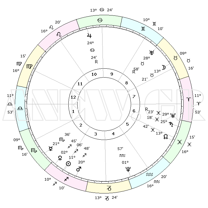 | | ΘΕΣΕΙΣ ΠΛΑΝΗΤΩΝ ΑΣΤΡΟΛΟΓΙΚΟΥ ΧΑΡΤΗ ΤΗΣ ΣΤΙΓΜΗΣ ΑΥΤΗΣ | | | | Πλανήτης | Ζώδιο | Μοίρες | Δεκαήμ. | Σε οίκο | Απόκλιση | | Ακμές των οίκων | | Ηλιος | Τοξότης | 11°04' | Δεύτερο | 3 | 22 S 06 | | 1ος | 03°55' | Ζυγός | | Σελήνη | Ταύρος | 12°56' | Δεύτερο | 8 | 19 N 48 | | 2ος | 00°46' | Σκορπιός | | Ερμής | Σκορπιός | 21°35' | Τρίτο | 2 | 15 S 38 | | 3ος | 01°21' | Τοξότης | | Αφροδίτη | Τοξότης | 02°43' | Πρώτο | 3 | 20 S 05 | | 4ος | 04°24' | Αιγόκερως | | Αρης | Τοξότης | 20°47' | Τρίτο | 3 | 23 S 47 | | 5ος | 07°20' | Υδροχόος | | Δίας | Καρκίνος | 24°24'R | Τρίτο | 10 | 21 N 24 | | 6ος | 07°37' | Ιχθείς | | Κρόνος | Ιχθείς | 25°18' | Τρίτο | 6 | 04 S 02 | | 7ος | 03°55' | Κριός | | Ουρανός | Ταύρος | 28°58'R | Τρίτο | 8 | 19 N 43 | | 8ος | 00°46' | Ταύρος | | Ποσειδώνας | Ιχθείς | 29°23'R | Τρίτο | 6 | 01 S 29 | | 9ος | 01°21' | Δίδυμοι | | Πλούτωνας | Υδροχόος | 01°57' | Πρώτο | 4 | 23 S 23 | | 10ος | 04°24' | Καρκίνος | | Β. Δεσμός | Ιχθείς | 13°42' | Δεύτερο | 6 | 06 S 24 | | 11ος | 07°20' | Λέων | | Ωροσκόπος | Ζυγός | 03°55' | Πρώτο | | | 12ος | 07°37' | Παρθένος | | Μεσουράνημα | Καρκίνος | 04°24' | Πρώτο | | | |
