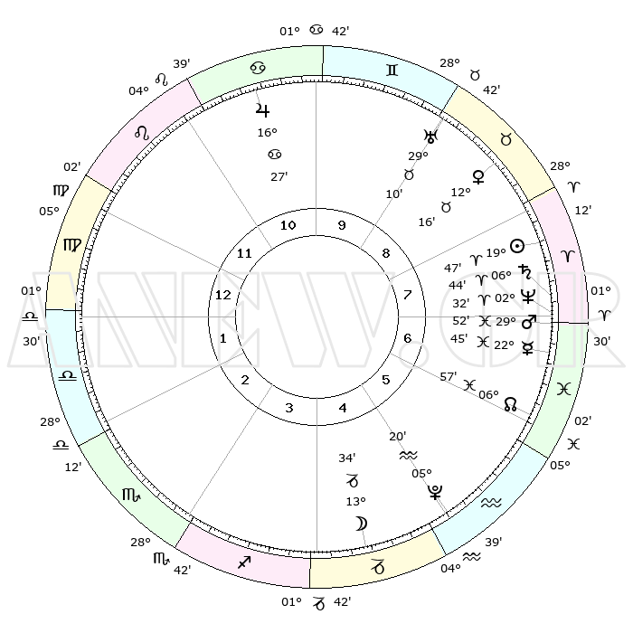 | | ΘΕΣΕΙΣ ΠΛΑΝΗΤΩΝ ΑΣΤΡΟΛΟΓΙΚΟΥ ΧΑΡΤΗ ΤΗΣ ΣΤΙΓΜΗΣ ΑΥΤΗΣ | | | | Πλανήτης | Ζώδιο | Μοίρες | Δεκαήμ. | Σε οίκο | Απόκλιση | | Ακμές των οίκων | | Ηλιος | Κριός | 19°44' | Δεύτερο | 8 | 07 N 43 | | 1ος | 14°32' | Παρθένος | | Σελήνη | Αιγόκερως | 12°52' | Δεύτερο | 4 | 27 S 02 | | 2ος | 09°50' | Ζυγός | | Ερμής | Ιχθείς | 22°41' | Τρίτο | 7 | 05 S 01 | | 3ος | 09°34' | Σκορπιός | | Αφροδίτη | Ταύρος | 12°12' | Δεύτερο | 9 | 15 N 25 | | 4ος | 12°30' | Τοξότης | | Αρης | Ιχθείς | 29°50' | Τρίτο | 7 | 01 S 00 | | 5ος | 15°53' | Αιγόκερως | | Δίας | Καρκίνος | 16°27' | Δεύτερο | 11 | 22 N 48 | | 6ος | 16°57' | Υδροχόος | | Κρόνος | Κριός | 06°43' | Πρώτο | 7 | 00 N 42 | | 7ος | 14°32' | Ιχθείς | | Ουρανός | Ταύρος | 29°09' | Τρίτο | 9 | 19 N 48 | | 8ος | 09°50' | Κριός | | Ποσειδώνας | Κριός | 02°32' | Πρώτο | 7 | 00 S 12 | | 9ος | 09°34' | Ταύρος | | Πλούτωνας | Υδροχόος | 05°20' | Πρώτο | 5 | 22 S 47 | | 10ος | 12°30' | Δίδυμοι | | Β. Δεσμός | Ιχθείς | 06°57' | Πρώτο | 6 | 08 S 57 | | 11ος | 15°53' | Καρκίνος | | Ωροσκόπος | Παρθένος | 14°32' | Δεύτερο | | | 12ος | 16°57' | Λέων | | Μεσουράνημα | Δίδυμοι | 12°30' | Δεύτερο | | | |