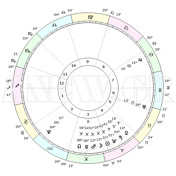 | | ΘΕΣΕΙΣ ΠΛΑΝΗΤΩΝ ΑΣΤΡΟΛΟΓΙΚΟΥ ΧΑΡΤΗ ΤΗΣ ΣΤΙΓΜΗΣ ΑΥΤΗΣ | | | | Πλανήτης | Ζώδιο | Μοίρες | Δεκαήμ. | Σε οίκο | Απόκλιση | | Ακμές των οίκων | | Ηλιος | Ιχθείς | 27°18' | Τρίτο | 4 | 01 S 04 | | 1ος | 27°32' | Σκορπιός | | Σελήνη | Ιχθείς | 12°25' | Δεύτερο | 4 | 06 S 36 | | 2ος | 28°21' | Τοξότης | | Ερμής | Ιχθείς | 08°56'R | Πρώτο | 3 | 06 S 38 | | 3ος | 03°39' | Υδροχόος | | Αφροδίτη | Κριός | 14°13' | Δεύτερο | 5 | 04 N 43 | | 4ος | 09°37' | Ιχθείς | | Αρης | Ιχθείς | 12°04' | Δεύτερο | 4 | 08 S 02 | | 5ος | 10°57' | Κριός | | Δίας | Καρκίνος | 15°10' | Δεύτερο | 8 | 22 N 56 | | 6ος | 06°20' | Ταύρος | | Κρόνος | Κριός | 03°54' | Πρώτο | 4 | 00 S 24 | | 7ος | 27°32' | Ταύρος | | Ουρανός | Ταύρος | 28°13' | Τρίτο | 7 | 19 N 35 | | 8ος | 28°21' | Δίδυμοι | | Ποσειδώνας | Κριός | 01°41' | Πρώτο | 4 | 00 S 32 | | 9ος | 03°39' | Λέων | | Πλούτωνας | Υδροχόος | 04°57' | Πρώτο | 3 | 22 S 49 | | 10ος | 09°37' | Παρθένος | | Β. Δεσμός | Ιχθείς | 08°09' | Πρώτο | 3 | 08 S 31 | | 11ος | 10°57' | Ζυγός | | Ωροσκόπος | Σκορπιός | 27°32' | Τρίτο | | | 12ος | 06°20' | Σκορπιός | | Μεσουράνημα | Παρθένος | 09°37' | Πρώτο | | | |
