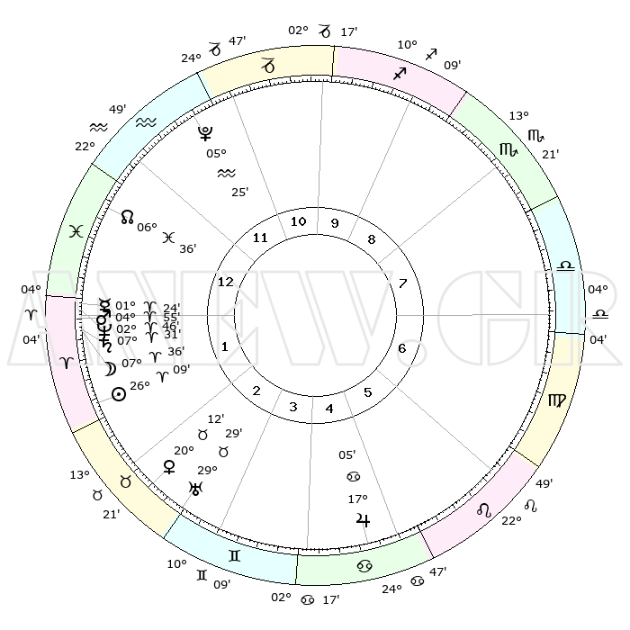 | | ΘΕΣΕΙΣ ΠΛΑΝΗΤΩΝ ΑΣΤΡΟΛΟΓΙΚΟΥ ΧΑΡΤΗ ΤΗΣ ΣΤΙΓΜΗΣ ΑΥΤΗΣ | | | | Πλανήτης | Ζώδιο | Μοίρες | Δεκαήμ. | Σε οίκο | Απόκλιση | | Ακμές των οίκων | | Ηλιος | Κριός | 26°05' | Τρίτο | 2 | 10 N 04 | | 1ος | 25°22' | Υδροχόος | | Σελήνη | Κριός | 06°38' | Πρώτο | 1 | 04 N 54 | | 2ος | 11°04' | Κριός | | Ερμής | Κριός | 01°19' | Πρώτο | 1 | 01 S 53 | | 3ος | 14°42' | Ταύρος | | Αφροδίτη | Ταύρος | 20°07' | Τρίτο | 3 | 17 N 59 | | 4ος | 09°35' | Δίδυμοι | | Αρης | Κριός | 04°52' | Πρώτο | 1 | 01 N 02 | | 5ος | 01°19' | Καρκίνος | | Δίας | Καρκίνος | 17°05' | Δεύτερο | 5 | 22 N 43 | | 6ος | 24°25' | Καρκίνος | | Κρόνος | Κριός | 07°31' | Πρώτο | 1 | 01 N 00 | | 7ος | 25°22' | Λέων | | Ουρανός | Ταύρος | 29°29' | Τρίτο | 3 | 19 N 52 | | 8ος | 11°04' | Ζυγός | | Ποσειδώνας | Κριός | 02°46' | Πρώτο | 1 | 00 S 06 | | 9ος | 14°42' | Σκορπιός | | Πλούτωνας | Υδροχόος | 05°25' | Πρώτο | 12 | 22 S 47 | | 10ος | 09°35' | Τοξότης | | Β. Δεσμός | Ιχθείς | 06°36' | Πρώτο | 1 | 09 S 05 | | 11ος | 01°19' | Αιγόκερως | | Ωροσκόπος | Υδροχόος | 25°22' | Τρίτο | | | 12ος | 24°25' | Αιγόκερως | | Μεσουράνημα | Τοξότης | 09°35' | Πρώτο | | | |