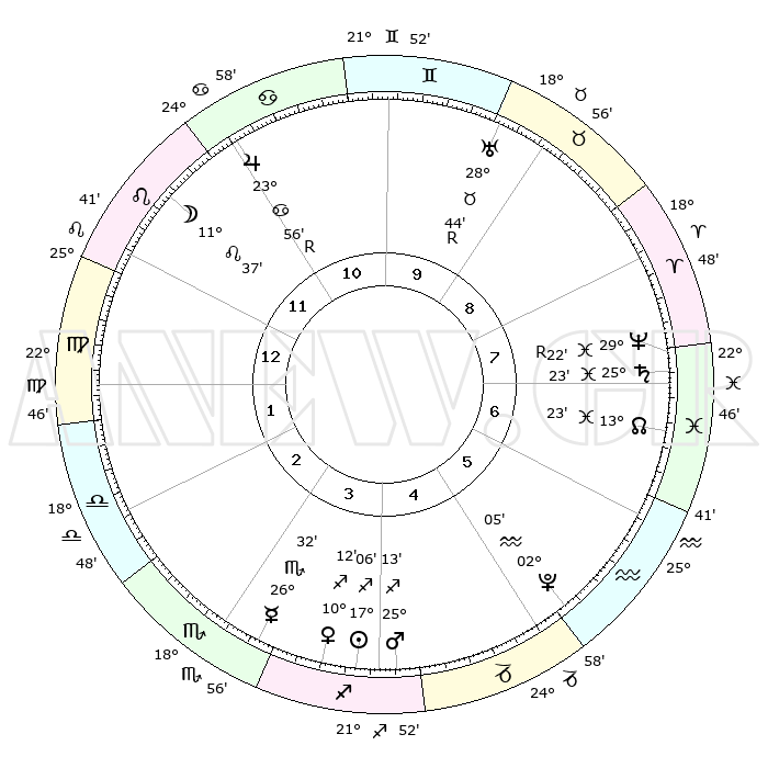 | | ΘΕΣΕΙΣ ΠΛΑΝΗΤΩΝ ΑΣΤΡΟΛΟΓΙΚΟΥ ΧΑΡΤΗ ΤΗΣ ΣΤΙΓΜΗΣ ΑΥΤΗΣ | | | | Πλανήτης | Ζώδιο | Μοίρες | Δεκαήμ. | Σε οίκο | Απόκλιση | | Ακμές των οίκων | | Ηλιος | Τοξότης | 17°03' | Δεύτερο | 4 | 22 S 48 | | 1ος | 10°43' | Παρθένος | | Σελήνη | Λέων | 11°03' | Δεύτερο | 11 | 20 N 01 | | 2ος | 05°40' | Ζυγός | | Ερμής | Σκορπιός | 26°29' | Τρίτο | 3 | 17 S 11 | | 3ος | 05°10' | Σκορπιός | | Αφροδίτη | Τοξότης | 10°09' | Δεύτερο | 4 | 21 S 34 | | 4ος | 08°07' | Τοξότης | | Αρης | Τοξότης | 25°12' | Τρίτο | 4 | 24 S 04 | | 5ος | 11°40' | Αιγόκερως | | Δίας | Καρκίνος | 23°56'R | Τρίτο | 11 | 21 N 29 | | 6ος | 12°55' | Υδροχόος | | Κρόνος | Ιχθείς | 25°23' | Τρίτο | 7 | 03 S 59 | | 7ος | 10°43' | Ιχθείς | | Ουρανός | Ταύρος | 28°44'R | Τρίτο | 9 | 19 N 40 | | 8ος | 05°40' | Κριός | | Ποσειδώνας | Ιχθείς | 29°22'R | Τρίτο | 7 | 01 S 29 | | 9ος | 05°10' | Ταύρος | | Πλούτωνας | Υδροχόος | 02°05' | Πρώτο | 5 | 23 S 21 | | 10ος | 08°07' | Δίδυμοι | | Β. Δεσμός | Ιχθείς | 13°24' | Δεύτερο | 7 | 06 S 32 | | 11ος | 11°40' | Καρκίνος | | Ωροσκόπος | Παρθένος | 10°43' | Δεύτερο | | | 12ος | 12°55' | Λέων | | Μεσουράνημα | Δίδυμοι | 08°07' | Πρώτο | | | |