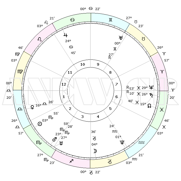 | | ΘΕΣΕΙΣ ΠΛΑΝΗΤΩΝ ΑΣΤΡΟΛΟΓΙΚΟΥ ΧΑΡΤΗ ΤΗΣ ΣΤΙΓΜΗΣ ΑΥΤΗΣ | | | | Πλανήτης | Ζώδιο | Μοίρες | Δεκαήμ. | Σε οίκο | Απόκλιση | | Ακμές των οίκων | | Ηλιος | Σκορπιός | 03°49' | Πρώτο | 3 | 12 S 47 | | 1ος | 03°12' | Παρθένος | | Σελήνη | Αιγόκερως | 03°29' | Πρώτο | 5 | 28 S 18 | | 2ος | 27°23' | Παρθένος | | Ερμής | Σκορπιός | 27°22' | Τρίτο | 3 | 22 S 14 | | 3ος | 26°20' | Ζυγός | | Αφροδίτη | Ζυγός | 16°19' | Δεύτερο | 2 | 05 S 01 | | 4ος | 29°16' | Σκορπιός | | Αρης | Σκορπιός | 23°55' | Τρίτο | 3 | 19 S 05 | | 5ος | 03°15' | Αιγόκερως | | Δίας | Καρκίνος | 24°45' | Τρίτο | 11 | 21 N 15 | | 6ος | 04°58' | Υδροχόος | | Κρόνος | Ιχθείς | 26°10'R | Τρίτο | 7 | 03 S 48 | | 7ος | 03°12' | Ιχθείς | | Ουρανός | Δίδυμοι | 00°27'R | Πρώτο | 10 | 20 N 02 | | 8ος | 27°23' | Ιχθείς | | Ποσειδώνας | Ιχθείς | 29°54'R | Τρίτο | 8 | 01 S 18 | | 9ος | 26°20' | Κριός | | Πλούτωνας | Υδροχόος | 01°24' | Πρώτο | 5 | 23 S 31 | | 10ος | 29°16' | Ταύρος | | Β. Δεσμός | Ιχθείς | 15°40' | Δεύτερο | 7 | 05 S 39 | | 11ος | 03°15' | Καρκίνος | | Ωροσκόπος | Παρθένος | 03°12' | Πρώτο | | | 12ος | 04°58' | Λέων | | Μεσουράνημα | Ταύρος | 29°16' | Τρίτο | | | |