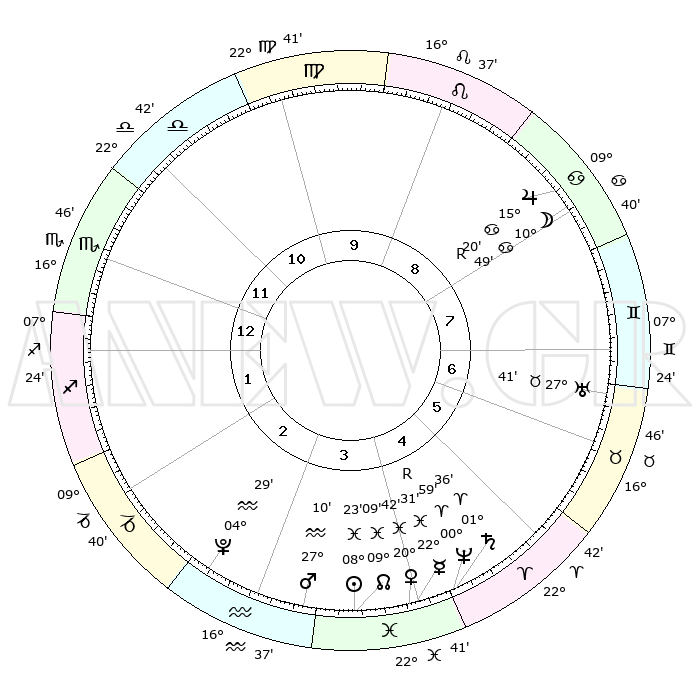 | | ΘΕΣΕΙΣ ΠΛΑΝΗΤΩΝ ΑΣΤΡΟΛΟΓΙΚΟΥ ΧΑΡΤΗ ΤΗΣ ΣΤΙΓΜΗΣ ΑΥΤΗΣ | | | | Πλανήτης | Ζώδιο | Μοίρες | Δεκαήμ. | Σε οίκο | Απόκλιση | | Ακμές των οίκων | | Ηλιος | Ιχθείς | 08°20' | Πρώτο | 4 | 08 S 27 | | 1ος | 22°33' | Σκορπιός | | Σελήνη | Καρκίνος | 10°06' | Δεύτερο | 8 | 27 N 34 | | 2ος | 22°46' | Τοξότης | | Ερμής | Ιχθείς | 22°32'R | Τρίτο | 4 | 00 S 17 | | 3ος | 27°17' | Αιγόκερως | | Αφροδίτη | Ιχθείς | 20°39' | Τρίτο | 4 | 04 S 59 | | 4ος | 03°03' | Ιχθείς | | Αρης | Υδροχόος | 27°07' | Τρίτο | 3 | 13 S 30 | | 5ος | 04°53' | Κριός | | Δίας | Καρκίνος | 15°20'R | Δεύτερο | 8 | 22 N 54 | | 6ος | 00°57' | Ταύρος | | Κρόνος | Κριός | 01°36' | Πρώτο | 4 | 01 S 20 | | 7ος | 22°33' | Ταύρος | | Ουρανός | Ταύρος | 27°41' | Τρίτο | 7 | 19 N 28 | | 8ος | 22°46' | Δίδυμοι | | Ποσειδώνας | Κριός | 00°59' | Πρώτο | 4 | 00 S 49 | | 9ος | 27°17' | Καρκίνος | | Πλούτωνας | Υδροχόος | 04°29' | Πρώτο | 3 | 22 S 53 | | 10ος | 03°03' | Παρθένος | | Β. Δεσμός | Ιχθείς | 09°09' | Πρώτο | 4 | 08 S 08 | | 11ος | 04°53' | Ζυγός | | Ωροσκόπος | Σκορπιός | 22°33' | Τρίτο | | | 12ος | 00°57' | Σκορπιός | | Μεσουράνημα | Παρθένος | 03°03' | Πρώτο | | | |