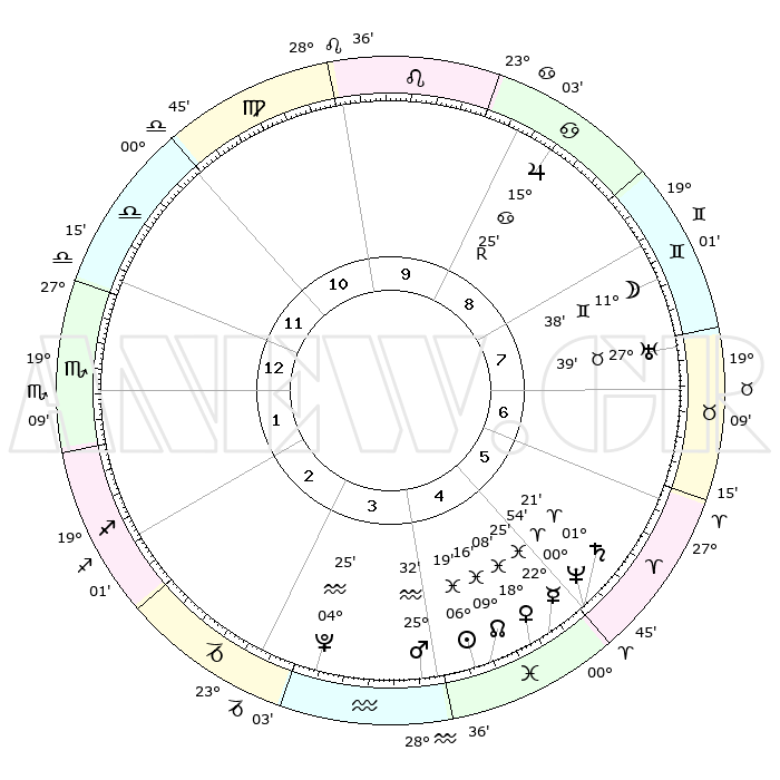 | | ΘΕΣΕΙΣ ΠΛΑΝΗΤΩΝ ΑΣΤΡΟΛΟΓΙΚΟΥ ΧΑΡΤΗ ΤΗΣ ΣΤΙΓΜΗΣ ΑΥΤΗΣ | | | | Πλανήτης | Ζώδιο | Μοίρες | Δεκαήμ. | Σε οίκο | Απόκλιση | | Ακμές των οίκων | | Ηλιος | Ιχθείς | 06°15' | Πρώτο | 4 | 09 S 13 | | 1ος | 03°16' | Σκορπιός | | Σελήνη | Δίδυμοι | 10°51' | Δεύτερο | 8 | 27 N 17 | | 2ος | 01°53' | Τοξότης | | Ερμής | Ιχθείς | 22°24' | Τρίτο | 5 | 00 S 45 | | 3ος | 04°07' | Αιγόκερως | | Αφροδίτη | Ιχθείς | 18°04' | Δεύτερο | 5 | 06 S 01 | | 4ος | 08°32' | Υδροχόος | | Αρης | Υδροχόος | 25°30' | Τρίτο | 4 | 14 S 03 | | 5ος | 11°24' | Ιχθείς | | Δίας | Καρκίνος | 15°25'R | Δεύτερο | 9 | 22 N 53 | | 6ος | 09°45' | Κριός | | Κρόνος | Κριός | 01°21' | Πρώτο | 5 | 01 S 25 | | 7ος | 03°16' | Ταύρος | | Ουρανός | Ταύρος | 27°39' | Τρίτο | 7 | 19 N 27 | | 8ος | 01°53' | Δίδυμοι | | Ποσειδώνας | Κριός | 00°54' | Πρώτο | 5 | 00 S 50 | | 9ος | 04°07' | Καρκίνος | | Πλούτωνας | Υδροχόος | 04°25' | Πρώτο | 3 | 22 S 54 | | 10ος | 08°32' | Λέων | | Β. Δεσμός | Ιχθείς | 09°16' | Πρώτο | 4 | 08 S 06 | | 11ος | 11°24' | Παρθένος | | Ωροσκόπος | Σκορπιός | 03°16' | Πρώτο | | | 12ος | 09°45' | Ζυγός | | Μεσουράνημα | Λέων | 08°32' | Πρώτο | | | |