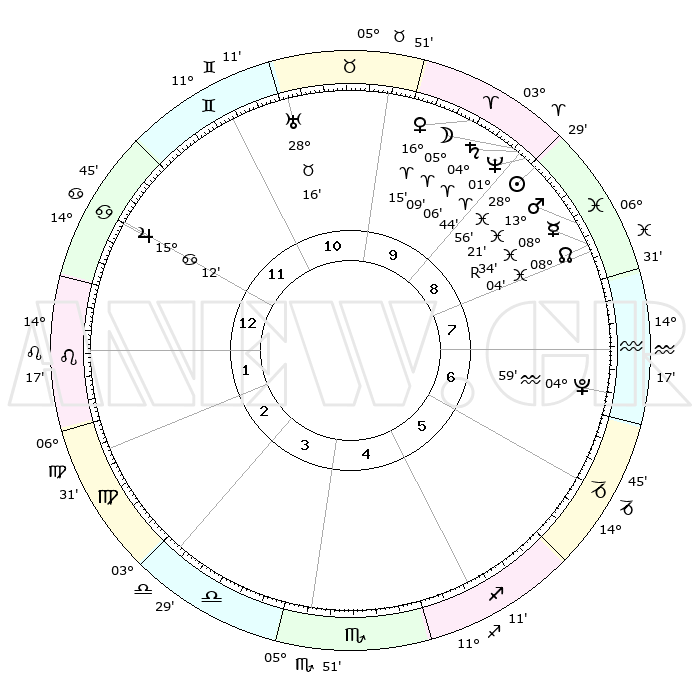 | | ΘΕΣΕΙΣ ΠΛΑΝΗΤΩΝ ΑΣΤΡΟΛΟΓΙΚΟΥ ΧΑΡΤΗ ΤΗΣ ΣΤΙΓΜΗΣ ΑΥΤΗΣ | | | | Πλανήτης | Ζώδιο | Μοίρες | Δεκαήμ. | Σε οίκο | Απόκλιση | | Ακμές των οίκων | | Ηλιος | Ιχθείς | 28°52' | Τρίτο | 9 | 00 S 27 | | 1ος | 24°40' | Καρκίνος | | Σελήνη | Κριός | 04°13' | Πρώτο | 9 | 03 N 44 | | 2ος | 15°23' | Λέων | | Ερμής | Ιχθείς | 08°35'R | Πρώτο | 8 | 07 S 08 | | 3ος | 09°44' | Παρθένος | | Αφροδίτη | Κριός | 16°10' | Δεύτερο | 10 | 05 N 31 | | 4ος | 10°03' | Ζυγός | | Αρης | Ιχθείς | 13°18' | Δεύτερο | 9 | 07 S 34 | | 5ος | 16°08' | Σκορπιός | | Δίας | Καρκίνος | 15°12' | Δεύτερο | 12 | 22 N 56 | | 6ος | 22°44' | Τοξότης | | Κρόνος | Κριός | 04°06' | Πρώτο | 9 | 00 S 19 | | 7ος | 24°40' | Αιγόκερως | | Ουρανός | Ταύρος | 28°16' | Τρίτο | 11 | 19 N 36 | | 8ος | 15°23' | Υδροχόος | | Ποσειδώνας | Κριός | 01°44' | Πρώτο | 9 | 00 S 30 | | 9ος | 09°44' | Ιχθείς | | Πλούτωνας | Υδροχόος | 04°59' | Πρώτο | 7 | 22 S 49 | | 10ος | 10°03' | Κριός | | Β. Δεσμός | Ιχθείς | 08°04' | Πρώτο | 8 | 08 S 33 | | 11ος | 16°08' | Ταύρος | | Ωροσκόπος | Καρκίνος | 24°40' | Τρίτο | | | 12ος | 22°44' | Δίδυμοι | | Μεσουράνημα | Κριός | 10°03' | Δεύτερο | | | |