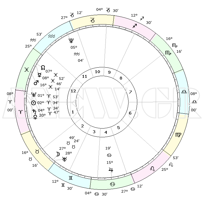 | | ΘΕΣΕΙΣ ΠΛΑΝΗΤΩΝ ΑΣΤΡΟΛΟΓΙΚΟΥ ΧΑΡΤΗ ΤΗΣ ΣΤΙΓΜΗΣ ΑΥΤΗΣ | | | | Πλανήτης | Ζώδιο | Μοίρες | Δεκαήμ. | Σε οίκο | Απόκλιση | | Ακμές των οίκων | | Ηλιος | Κριός | 02°30' | Πρώτο | 1 | 01 N 00 | | 1ος | 29°39' | Υδροχόος | | Σελήνη | Ταύρος | 26°51' | Τρίτο | 3 | 24 N 26 | | 2ος | 15°06' | Κριός | | Ερμής | Ιχθείς | 08°45' | Πρώτο | 1 | 07 S 53 | | 3ος | 17°53' | Ταύρος | | Αφροδίτη | Κριός | 20°42' | Τρίτο | 2 | 07 N 21 | | 4ος | 12°19' | Δίδυμοι | | Αρης | Ιχθείς | 16°11' | Δεύτερο | 1 | 06 S 26 | | 5ος | 04°00' | Καρκίνος | | Δίας | Καρκίνος | 15°19' | Δεύτερο | 5 | 22 N 55 | | 6ος | 27°32' | Καρκίνος | | Κρόνος | Κριός | 04°33' | Πρώτο | 1 | 00 S 08 | | 7ος | 29°39' | Λέων | | Ουρανός | Ταύρος | 28°24' | Τρίτο | 3 | 19 N 38 | | 8ος | 15°06' | Ζυγός | | Ποσειδώνας | Κριός | 01°53' | Πρώτο | 1 | 00 S 27 | | 9ος | 17°53' | Σκορπιός | | Πλούτωνας | Υδροχόος | 05°03' | Πρώτο | 12 | 22 S 48 | | 10ος | 12°19' | Τοξότης | | Β. Δεσμός | Ιχθείς | 07°52' | Πρώτο | 1 | 08 S 37 | | 11ος | 04°00' | Αιγόκερως | | Ωροσκόπος | Υδροχόος | 29°39' | Τρίτο | | | 12ος | 27°31' | Αιγόκερως | | Μεσουράνημα | Τοξότης | 12°19' | Δεύτερο | | | |