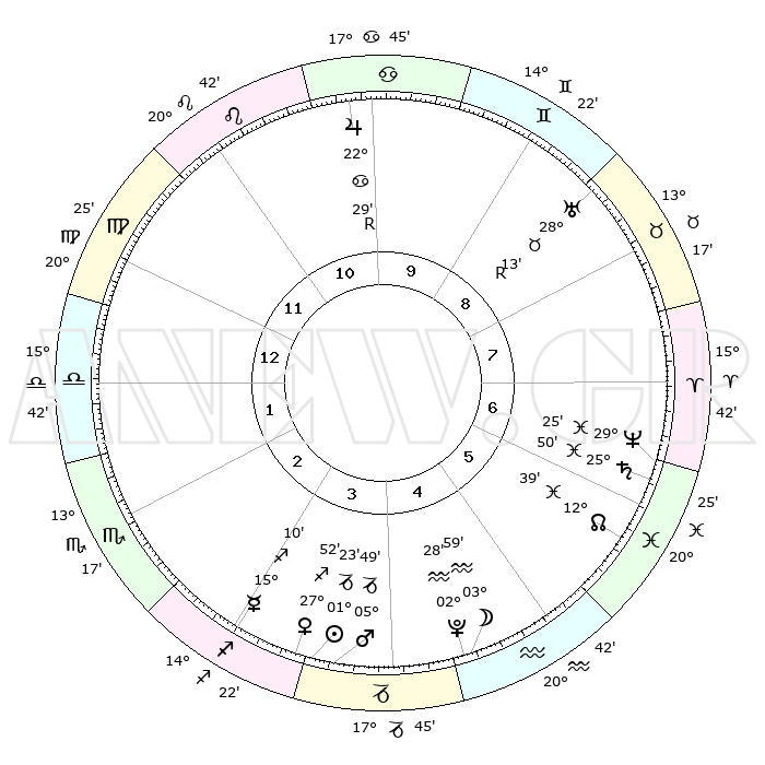 | | ΘΕΣΕΙΣ ΠΛΑΝΗΤΩΝ ΑΣΤΡΟΛΟΓΙΚΟΥ ΧΑΡΤΗ ΤΗΣ ΣΤΙΓΜΗΣ ΑΥΤΗΣ | | | | Πλανήτης | Ζώδιο | Μοίρες | Δεκαήμ. | Σε οίκο | Απόκλιση | | Ακμές των οίκων | | Ηλιος | Αιγόκερως | 01°18' | Πρώτο | 4 | 23 S 26 | | 1ος | 22°34' | Παρθένος | | Σελήνη | Υδροχόος | 03°01' | Πρώτο | 5 | 22 S 32 | | 2ος | 18°35' | Ζυγός | | Ερμής | Τοξότης | 15°03' | Δεύτερο | 3 | 22 S 05 | | 3ος | 18°43' | Σκορπιός | | Αφροδίτη | Τοξότης | 27°46' | Τρίτο | 4 | 23 S 34 | | 4ος | 21°39' | Τοξότης | | Αρης | Αιγόκερως | 05°45' | Πρώτο | 4 | 24 S 08 | | 5ος | 24°46' | Αιγόκερως | | Δίας | Καρκίνος | 22°29'R | Τρίτο | 10 | 21 N 46 | | 6ος | 25°29' | Υδροχόος | | Κρόνος | Ιχθείς | 25°49' | Τρίτο | 7 | 03 S 46 | | 7ος | 22°34' | Ιχθείς | | Ουρανός | Ταύρος | 28°13'R | Τρίτο | 9 | 19 N 34 | | 8ος | 18°35' | Κριός | | Ποσειδώνας | Ιχθείς | 29°25' | Τρίτο | 7 | 01 S 28 | | 9ος | 18°43' | Ταύρος | | Πλούτωνας | Υδροχόος | 02°27' | Πρώτο | 5 | 23 S 17 | | 10ος | 21°39' | Δίδυμοι | | Β. Δεσμός | Ιχθείς | 12°39' | Δεύτερο | 6 | 06 S 49 | | 11ος | 24°46' | Καρκίνος | | Ωροσκόπος | Παρθένος | 22°34' | Τρίτο | | | 12ος | 25°29' | Λέων | | Μεσουράνημα | Δίδυμοι | 21°39' | Τρίτο | | | |