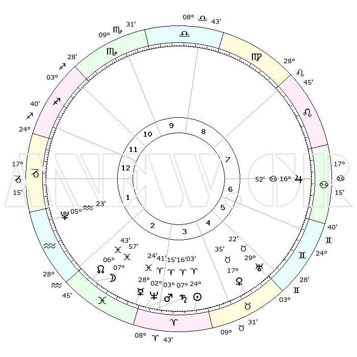 | | ΘΕΣΕΙΣ ΠΛΑΝΗΤΩΝ ΑΣΤΡΟΛΟΓΙΚΟΥ ΧΑΡΤΗ ΤΗΣ ΣΤΙΓΜΗΣ ΑΥΤΗΣ | | | | Πλανήτης | Ζώδιο | Μοίρες | Δεκαήμ. | Σε οίκο | Απόκλιση | | Ακμές των οίκων | | Ηλιος | Κριός | 23°59' | Τρίτο | 4 | 09 N 18 | | 1ος | 22°53' | Τοξότης | | Σελήνη | Ιχθείς | 07°00' | Πρώτο | 2 | 09 S 02 | | 2ος | 28°18' | Αιγόκερως | | Ερμής | Ιχθείς | 28°18' | Τρίτο | 3 | 03 S 01 | | 3ος | 07°36' | Ιχθείς | | Αφροδίτη | Ταύρος | 17°29' | Δεύτερο | 5 | 17 N 10 | | 4ος | 12°33' | Κριός | | Αρης | Κριός | 03°11' | Πρώτο | 3 | 00 N 22 | | 5ος | 10°02' | Ταύρος | | Δίας | Καρκίνος | 16°51' | Δεύτερο | 7 | 22 N 45 | | 6ος | 02°24' | Δίδυμοι | | Κρόνος | Κριός | 07°15' | Πρώτο | 3 | 00 N 55 | | 7ος | 22°53' | Δίδυμοι | | Ουρανός | Ταύρος | 29°22' | Τρίτο | 5 | 19 N 51 | | 8ος | 28°18' | Καρκίνος | | Ποσειδώνας | Κριός | 02°41' | Πρώτο | 3 | 00 S 08 | | 9ος | 07°36' | Παρθένος | | Πλούτωνας | Υδροχόος | 05°23' | Πρώτο | 2 | 22 S 47 | | 10ος | 12°33' | Ζυγός | | Β. Δεσμός | Ιχθείς | 06°43' | Πρώτο | 2 | 09 S 03 | | 11ος | 10°02' | Σκορπιός | | Ωροσκόπος | Τοξότης | 22°53' | Τρίτο | | | 12ος | 02°24' | Τοξότης | | Μεσουράνημα | Ζυγός | 12°33' | Δεύτερο | | | |