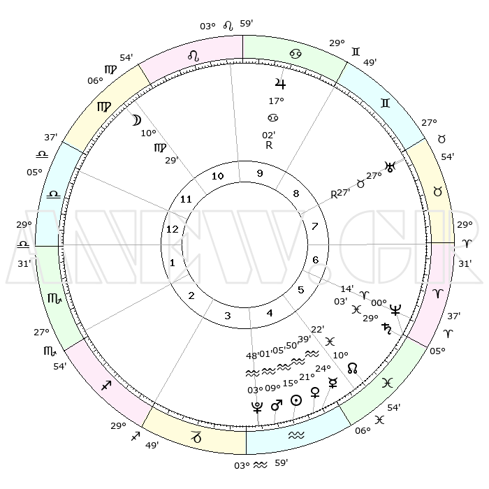 | | ΘΕΣΕΙΣ ΠΛΑΝΗΤΩΝ ΑΣΤΡΟΛΟΓΙΚΟΥ ΧΑΡΤΗ ΤΗΣ ΣΤΙΓΜΗΣ ΑΥΤΗΣ | | | | Πλανήτης | Ζώδιο | Μοίρες | Δεκαήμ. | Σε οίκο | Απόκλιση | | Ακμές των οίκων | | Ηλιος | Υδροχόος | 15°02' | Δεύτερο | 4 | 16 S 19 | | 1ος | 14°41' | Ζυγός | | Σελήνη | Παρθένος | 09°49' | Πρώτο | 11 | 07 N 49 | | 2ος | 12°13' | Σκορπιός | | Ερμής | Υδροχόος | 24°33' | Τρίτο | 5 | 14 S 54 | | 3ος | 13°15' | Τοξότης | | Αφροδίτη | Υδροχόος | 21°47' | Τρίτο | 5 | 15 S 34 | | 4ος | 16°36' | Αιγόκερως | | Αρης | Υδροχόος | 08°59' | Πρώτο | 4 | 19 S 01 | | 5ος | 19°32' | Υδροχόος | | Δίας | Καρκίνος | 17°03'R | Δεύτερο | 10 | 22 N 39 | | 6ος | 19°19' | Ιχθείς | | Κρόνος | Ιχθείς | 29°03' | Τρίτο | 6 | 02 S 22 | | 7ος | 14°41' | Κριός | | Ουρανός | Ταύρος | 27°27'R | Τρίτο | 8 | 19 N 24 | | 8ος | 12°13' | Ταύρος | | Ποσειδώνας | Κριός | 00°13' | Πρώτο | 6 | 01 S 07 | | 9ος | 13°15' | Δίδυμοι | | Πλούτωνας | Υδροχόος | 03°48' | Πρώτο | 4 | 23 S 00 | | 10ος | 16°36' | Καρκίνος | | Β. Δεσμός | Ιχθείς | 10°23' | Δεύτερο | 5 | 07 S 41 | | 11ος | 19°32' | Λέων | | Ωροσκόπος | Ζυγός | 14°41' | Δεύτερο | | | 12ος | 19°19' | Παρθένος | | Μεσουράνημα | Καρκίνος | 16°36' | Δεύτερο | | | |