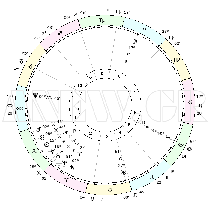 | | ΘΕΣΕΙΣ ΠΛΑΝΗΤΩΝ ΑΣΤΡΟΛΟΓΙΚΟΥ ΧΑΡΤΗ ΤΗΣ ΣΤΙΓΜΗΣ ΑΥΤΗΣ | | | | Πλανήτης | Ζώδιο | Μοίρες | Δεκαήμ. | Σε οίκο | Απόκλιση | | Ακμές των οίκων | | Ηλιος | Ιχθείς | 15°30' | Δεύτερο | 2 | 05 S 43 | | 1ος | 12°31' | Αιγόκερως | | Σελήνη | Ζυγός | 16°21' | Δεύτερο | 9 | 09 S 23 | | 2ος | 22°52' | Υδροχόος | | Ερμής | Ιχθείς | 18°15'R | Δεύτερο | 2 | 01 S 15 | | 3ος | 03°06' | Κριός | | Αφροδίτη | Ιχθείς | 29°32' | Τρίτο | 2 | 01 S 21 | | 4ος | 04°48' | Ταύρος | | Αρης | Ιχθείς | 02°45' | Πρώτο | 2 | 11 S 31 | | 5ος | 29°18' | Ταύρος | | Δίας | Καρκίνος | 15°08'R | Δεύτερο | 7 | 22 N 55 | | 6ος | 20°35' | Δίδυμοι | | Κρόνος | Κριός | 02°27' | Πρώτο | 2 | 00 S 59 | | 7ος | 12°31' | Καρκίνος | | Ουρανός | Ταύρος | 27°51' | Τρίτο | 4 | 19 N 30 | | 8ος | 22°52' | Λέων | | Ποσειδώνας | Κριός | 01°14' | Πρώτο | 2 | 00 S 42 | | 9ος | 03°06' | Ζυγός | | Πλούτωνας | Υδροχόος | 04°40' | Πρώτο | 1 | 22 S 51 | | 10ος | 04°48' | Σκορπιός | | Β. Δεσμός | Ιχθείς | 08°47' | Πρώτο | 2 | 08 S 17 | | 11ος | 29°18' | Σκορπιός | | Ωροσκόπος | Αιγόκερως | 12°31' | Δεύτερο | | | 12ος | 20°35' | Τοξότης | | Μεσουράνημα | Σκορπιός | 04°48' | Πρώτο | | | |