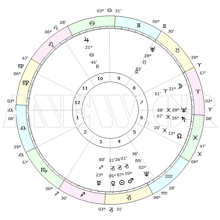 | | ΘΕΣΕΙΣ ΠΛΑΝΗΤΩΝ ΑΣΤΡΟΛΟΓΙΚΟΥ ΧΑΡΤΗ ΤΗΣ ΣΤΙΓΜΗΣ ΑΥΤΗΣ | | | | Πλανήτης | Ζώδιο | Μοίρες | Δεκαήμ. | Σε οίκο | Απόκλιση | | Ακμές των οίκων | | Ηλιος | Αιγόκερως | 07°21' | Πρώτο | 4 | 23 S 14 | | 1ος | 10°27' | Παρθένος | | Σελήνη | Κριός | 20°46' | Τρίτο | 8 | 11 N 06 | | 2ος | 05°22' | Ζυγός | | Ερμής | Τοξότης | 23°53' | Τρίτο | 4 | 23 S 30 | | 3ος | 04°51' | Σκορπιός | | Αφροδίτη | Αιγόκερως | 05°15' | Πρώτο | 4 | 23 S 43 | | 4ος | 07°48' | Τοξότης | | Αρης | Αιγόκερως | 10°17' | Δεύτερο | 4 | 23 S 54 | | 5ος | 11°22' | Αιγόκερως | | Δίας | Καρκίνος | 21°46'R | Τρίτο | 11 | 21 N 54 | | 6ος | 12°38' | Υδροχόος | | Κρόνος | Ιχθείς | 26°07' | Τρίτο | 7 | 03 S 38 | | 7ος | 10°27' | Ιχθείς | | Ουρανός | Ταύρος | 28°02'R | Τρίτο | 9 | 19 N 31 | | 8ος | 05°22' | Κριός | | Ποσειδώνας | Ιχθείς | 29°28' | Τρίτο | 7 | 01 S 26 | | 9ος | 04°51' | Ταύρος | | Πλούτωνας | Υδροχόος | 02°38' | Πρώτο | 5 | 23 S 14 | | 10ος | 07°48' | Δίδυμοι | | Β. Δεσμός | Ιχθείς | 12°20' | Δεύτερο | 7 | 06 S 56 | | 11ος | 11°22' | Καρκίνος | | Ωροσκόπος | Παρθένος | 10°27' | Δεύτερο | | | 12ος | 12°38' | Λέων | | Μεσουράνημα | Δίδυμοι | 07°48' | Πρώτο | | | |