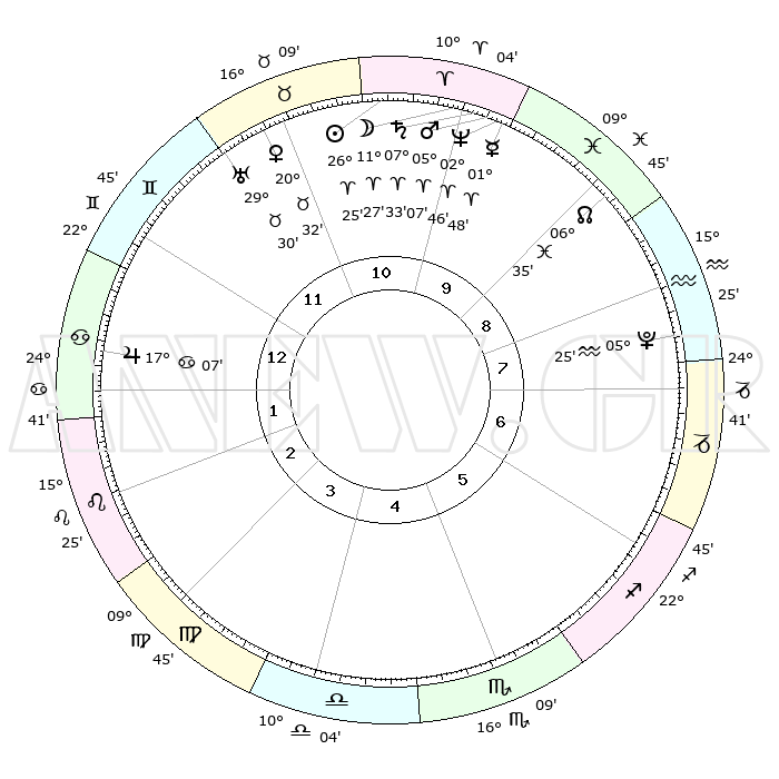 | | ΘΕΣΕΙΣ ΠΛΑΝΗΤΩΝ ΑΣΤΡΟΛΟΓΙΚΟΥ ΧΑΡΤΗ ΤΗΣ ΣΤΙΓΜΗΣ ΑΥΤΗΣ | | | | Πλανήτης | Ζώδιο | Μοίρες | Δεκαήμ. | Σε οίκο | Απόκλιση | | Ακμές των οίκων | | Ηλιος | Κριός | 26°20' | Τρίτο | 11 | 10 N 10 | | 1ος | 29°41' | Δίδυμοι | | Σελήνη | Κριός | 10°17' | Δεύτερο | 10 | 06 N 36 | | 2ος | 20°30' | Καρκίνος | | Ερμής | Κριός | 01°41' | Πρώτο | 10 | 01 S 44 | | 3ος | 12°17' | Λέων | | Αφροδίτη | Ταύρος | 20°26' | Τρίτο | 11 | 18 N 04 | | 4ος | 08°33' | Παρθένος | | Αρης | Κριός | 05°03' | Πρώτο | 10 | 01 N 07 | | 5ος | 12°26' | Ζυγός | | Δίας | Καρκίνος | 17°06' | Δεύτερο | 1 | 22 N 43 | | 6ος | 22°27' | Σκορπιός | | Κρόνος | Κριός | 07°33' | Πρώτο | 10 | 01 N 01 | | 7ος | 29°41' | Τοξότης | | Ουρανός | Ταύρος | 29°29' | Τρίτο | 12 | 19 N 52 | | 8ος | 20°30' | Αιγόκερως | | Ποσειδώνας | Κριός | 02°46' | Πρώτο | 10 | 00 S 06 | | 9ος | 12°17' | Υδροχόος | | Πλούτωνας | Υδροχόος | 05°25' | Πρώτο | 8 | 22 S 47 | | 10ος | 08°33' | Ιχθείς | | Β. Δεσμός | Ιχθείς | 06°36' | Πρώτο | 9 | 09 S 05 | | 11ος | 12°26' | Κριός | | Ωροσκόπος | Δίδυμοι | 29°41' | Τρίτο | | | 12ος | 22°27' | Ταύρος | | Μεσουράνημα | Ιχθείς | 08°33' | Πρώτο | | | |