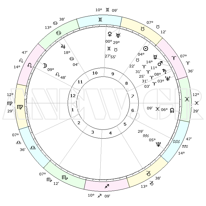 | | ΘΕΣΕΙΣ ΠΛΑΝΗΤΩΝ ΑΣΤΡΟΛΟΓΙΚΟΥ ΧΑΡΤΗ ΤΗΣ ΣΤΙΓΜΗΣ ΑΥΤΗΣ | | | | Πλανήτης | Ζώδιο | Μοίρες | Δεκαήμ. | Σε οίκο | Απόκλιση | | Ακμές των οίκων | | Ηλιος | Ταύρος | 04°18' | Πρώτο | 9 | 12 N 57 | | 1ος | 25°40' | Λέων | | Σελήνη | Λέων | 09°01' | Πρώτο | 12 | 20 N 20 | | 2ος | 19°04' | Παρθένος | | Ερμής | Κριός | 14°26' | Δεύτερο | 8 | 03 N 25 | | 3ος | 17°19' | Ζυγός | | Αφροδίτη | Δίδυμοι | 00°23' | Πρώτο | 10 | 20 N 49 | | 4ος | 20°10' | Σκορπιός | | Αρης | Κριός | 11°22' | Δεύτερο | 8 | 03 N 38 | | 5ος | 24°39' | Τοξότης | | Δίας | Καρκίνος | 18°03' | Δεύτερο | 11 | 22 N 36 | | 6ος | 26°59' | Αιγόκερως | | Κρόνος | Κριός | 08°31' | Πρώτο | 8 | 01 N 23 | | 7ος | 25°40' | Υδροχόος | | Ουρανός | Ταύρος | 29°55' | Τρίτο | 10 | 19 N 58 | | 8ος | 19°04' | Ιχθείς | | Ποσειδώνας | Κριός | 03°03' | Πρώτο | 8 | 00 N 00 | | 9ος | 17°19' | Κριός | | Πλούτωνας | Υδροχόος | 05°28' | Πρώτο | 6 | 22 S 48 | | 10ος | 20°10' | Ταύρος | | Β. Δεσμός | Ιχθείς | 06°10' | Πρώτο | 7 | 09 S 15 | | 11ος | 24°39' | Δίδυμοι | | Ωροσκόπος | Λέων | 25°40' | Τρίτο | | | 12ος | 26°59' | Καρκίνος | | Μεσουράνημα | Ταύρος | 20°10' | Τρίτο | | | |