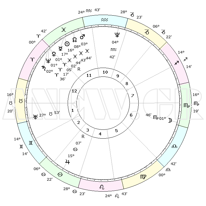 | | ΘΕΣΕΙΣ ΠΛΑΝΗΤΩΝ ΑΣΤΡΟΛΟΓΙΚΟΥ ΧΑΡΤΗ ΤΗΣ ΣΤΙΓΜΗΣ ΑΥΤΗΣ | | | | Πλανήτης | Ζώδιο | Μοίρες | Δεκαήμ. | Σε οίκο | Απόκλιση | | Ακμές των οίκων | | Ηλιος | Ιχθείς | 16°40' | Δεύτερο | 12 | 05 S 16 | | 1ος | 07°13' | Κριός | | Σελήνη | Σκορπιός | 00°53' | Πρώτο | 7 | 15 S 40 | | 2ος | 15°42' | Ταύρος | | Ερμής | Ιχθείς | 17°06'R | Δεύτερο | 12 | 01 S 44 | | 3ος | 12°02' | Δίδυμοι | | Αφροδίτη | Κριός | 00°60' | Πρώτο | 12 | 00 S 45 | | 4ος | 04°04' | Καρκίνος | | Αρης | Ιχθείς | 03°40' | Πρώτο | 12 | 11 S 11 | | 5ος | 26°43' | Καρκίνος | | Δίας | Καρκίνος | 15°07'R | Δεύτερο | 4 | 22 N 56 | | 6ος | 25°17' | Λέων | | Κρόνος | Κριός | 02°35' | Πρώτο | 12 | 00 S 55 | | 7ος | 07°13' | Ζυγός | | Ουρανός | Ταύρος | 27°53' | Τρίτο | 2 | 19 N 31 | | 8ος | 15°42' | Σκορπιός | | Ποσειδώνας | Κριός | 01°17' | Πρώτο | 12 | 00 S 41 | | 9ος | 12°02' | Τοξότης | | Πλούτωνας | Υδροχόος | 04°42' | Πρώτο | 11 | 22 S 51 | | 10ος | 04°04' | Αιγόκερως | | Β. Δεσμός | Ιχθείς | 08°43' | Πρώτο | 12 | 08 S 18 | | 11ος | 26°43' | Αιγόκερως | | Ωροσκόπος | Κριός | 07°13' | Πρώτο | | | 12ος | 25°17' | Υδροχόος | | Μεσουράνημα | Αιγόκερως | 04°04' | Πρώτο | | | |