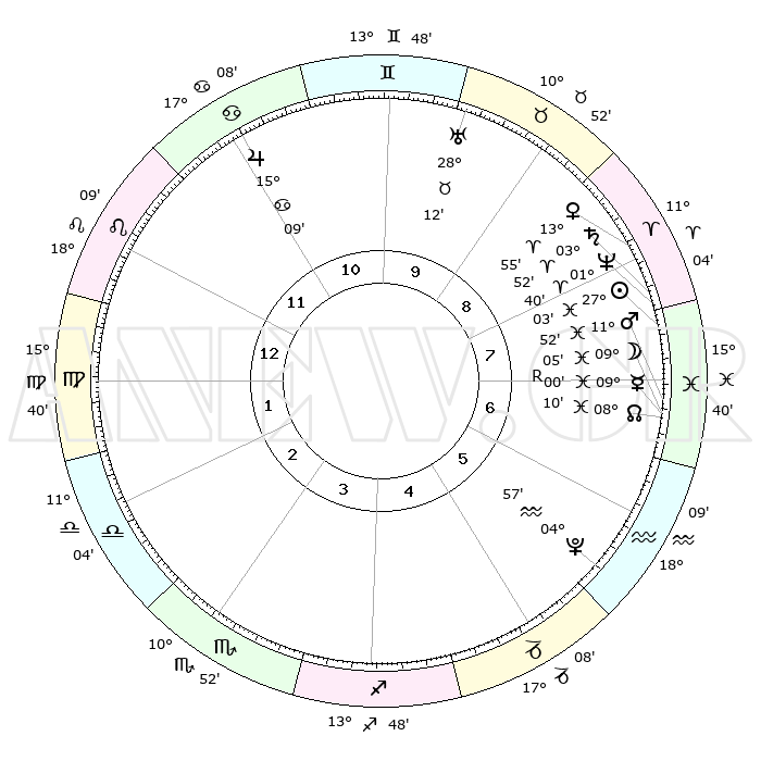 | | ΘΕΣΕΙΣ ΠΛΑΝΗΤΩΝ ΑΣΤΡΟΛΟΓΙΚΟΥ ΧΑΡΤΗ ΤΗΣ ΣΤΙΓΜΗΣ ΑΥΤΗΣ | | | | Πλανήτης | Ζώδιο | Μοίρες | Δεκαήμ. | Σε οίκο | Απόκλιση | | Ακμές των οίκων | | Ηλιος | Ιχθείς | 26°60' | Τρίτο | 8 | 01 S 12 | | 1ος | 27°48' | Λέων | | Σελήνη | Ιχθείς | 08°16' | Πρώτο | 7 | 08 S 32 | | 2ος | 21°25' | Παρθένος | | Ερμής | Ιχθείς | 09°01'R | Πρώτο | 7 | 06 S 32 | | 3ος | 19°53' | Ζυγός | | Αφροδίτη | Κριός | 13°51' | Δεύτερο | 8 | 04 N 34 | | 4ος | 22°47' | Σκορπιός | | Αρης | Ιχθείς | 11°49' | Δεύτερο | 7 | 08 S 08 | | 5ος | 27°07' | Τοξότης | | Δίας | Καρκίνος | 15°09' | Δεύτερο | 11 | 22 N 56 | | 6ος | 29°15' | Αιγόκερως | | Κρόνος | Κριός | 03°52' | Πρώτο | 8 | 00 S 25 | | 7ος | 27°48' | Υδροχόος | | Ουρανός | Ταύρος | 28°12' | Τρίτο | 10 | 19 N 35 | | 8ος | 21°25' | Ιχθείς | | Ποσειδώνας | Κριός | 01°40' | Πρώτο | 8 | 00 S 32 | | 9ος | 19°53' | Κριός | | Πλούτωνας | Υδροχόος | 04°57' | Πρώτο | 6 | 22 S 49 | | 10ος | 22°46' | Ταύρος | | Β. Δεσμός | Ιχθείς | 08°10' | Πρώτο | 7 | 08 S 30 | | 11ος | 27°07' | Δίδυμοι | | Ωροσκόπος | Λέων | 27°48' | Τρίτο | | | 12ος | 29°15' | Καρκίνος | | Μεσουράνημα | Ταύρος | 22°46' | Τρίτο | | | |